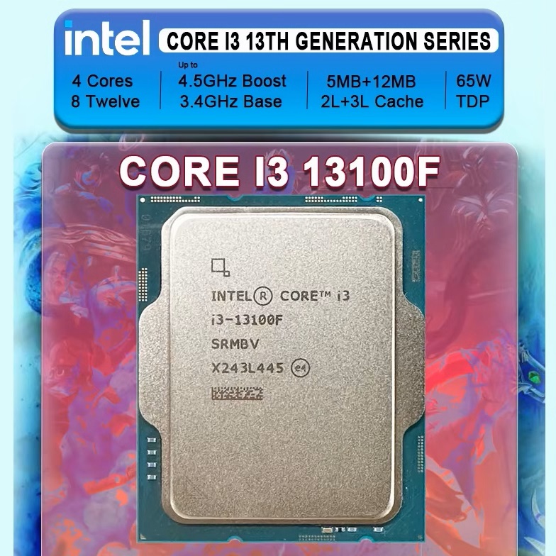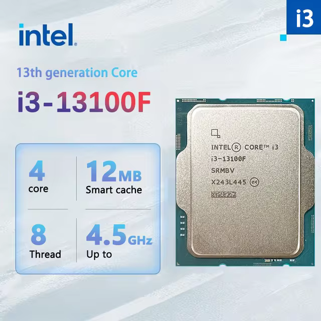 - 13th Gen Intel Core i3-13100F desktop processors, without processor graphics. Featuring PCIe 5.0 & 4.0 support, DDR5 and DDR4 support, 13th Gen Intel Core i3 desktop processors are optimized for productivity. Discrete graphics required. Compatible with Intel 700 Series and Intel 600 Series Chipset based motherboards. 58W Processor Base Power.