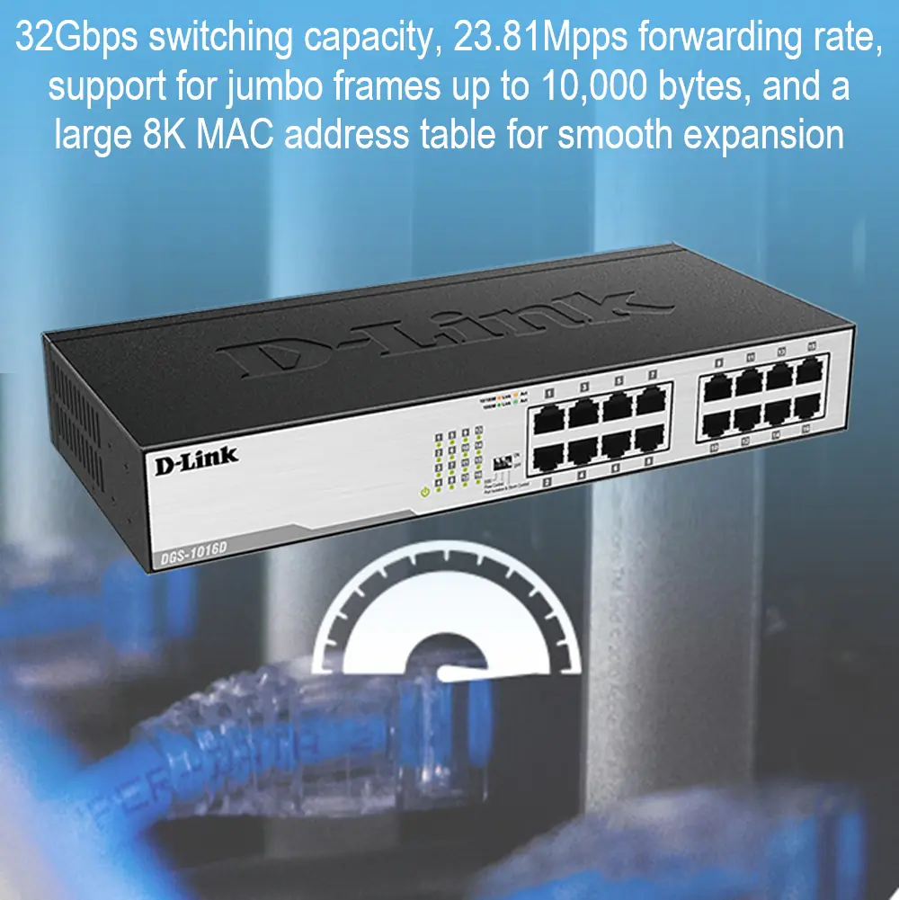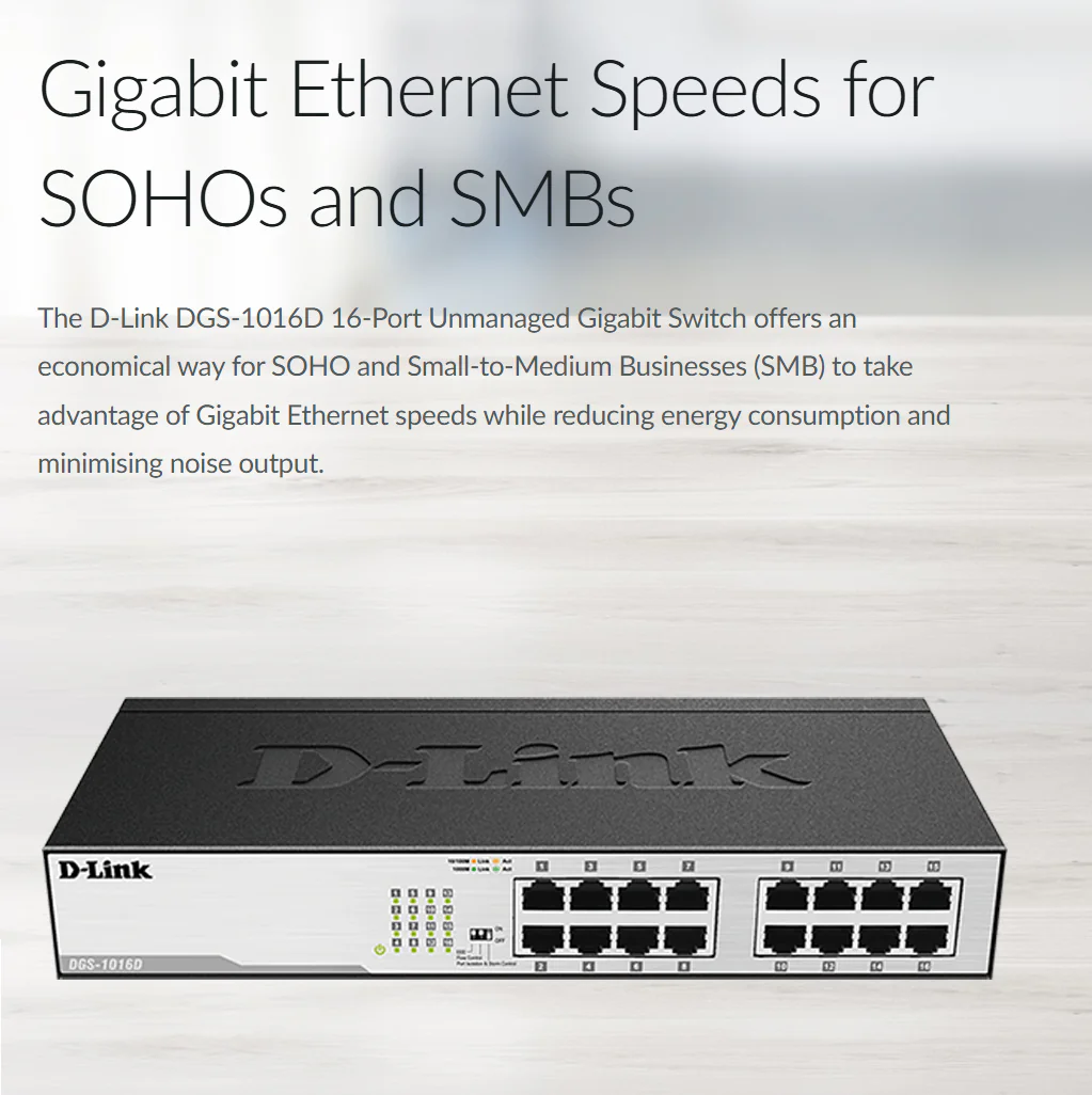 D-Link 16-Port Gigabit Unmanaged Desktop Switch With 32Gbps Switching Capacity, Fanless Silent Design, EEE Green Technology, Storm Control, NDAA/TAA Compliant | DGS-1016D