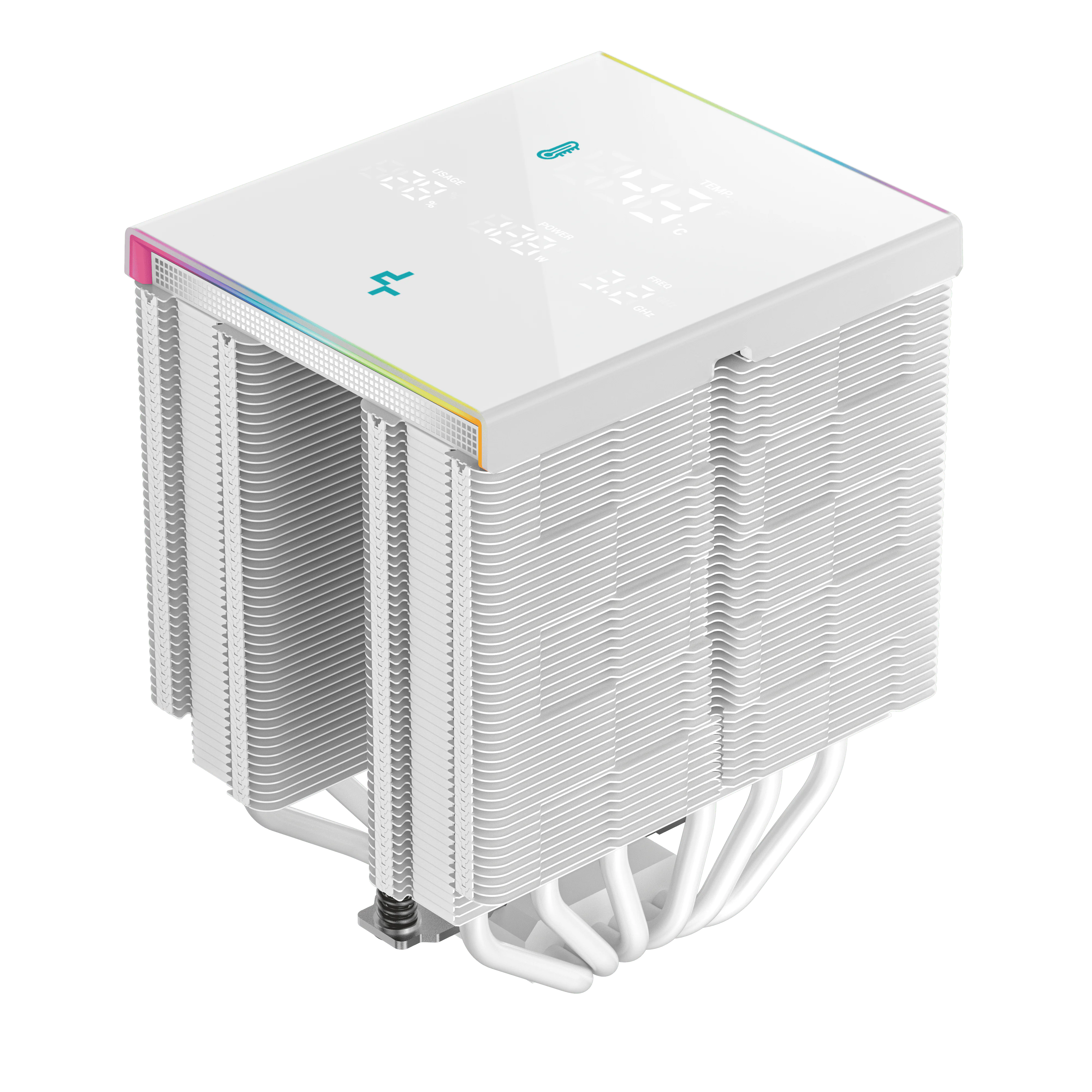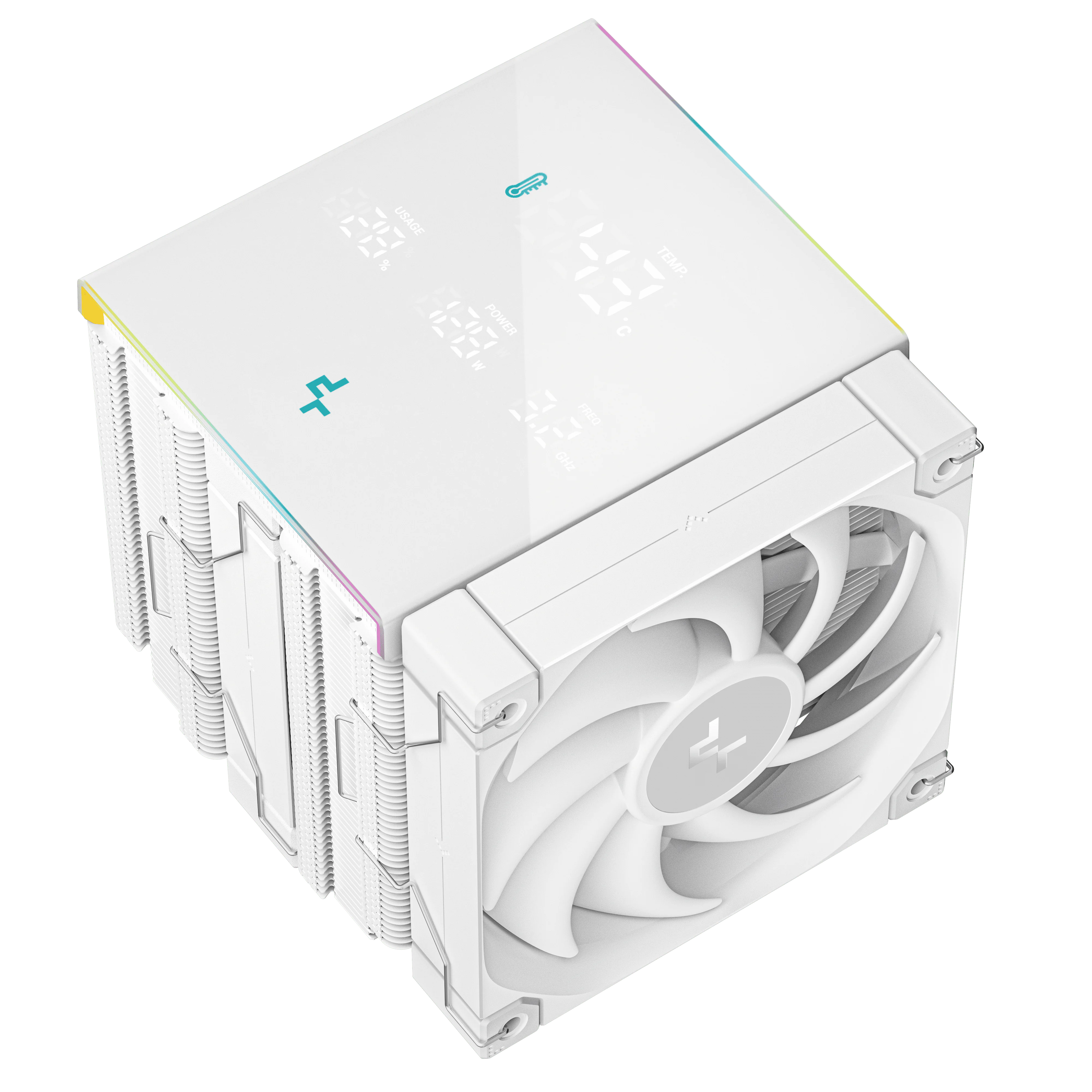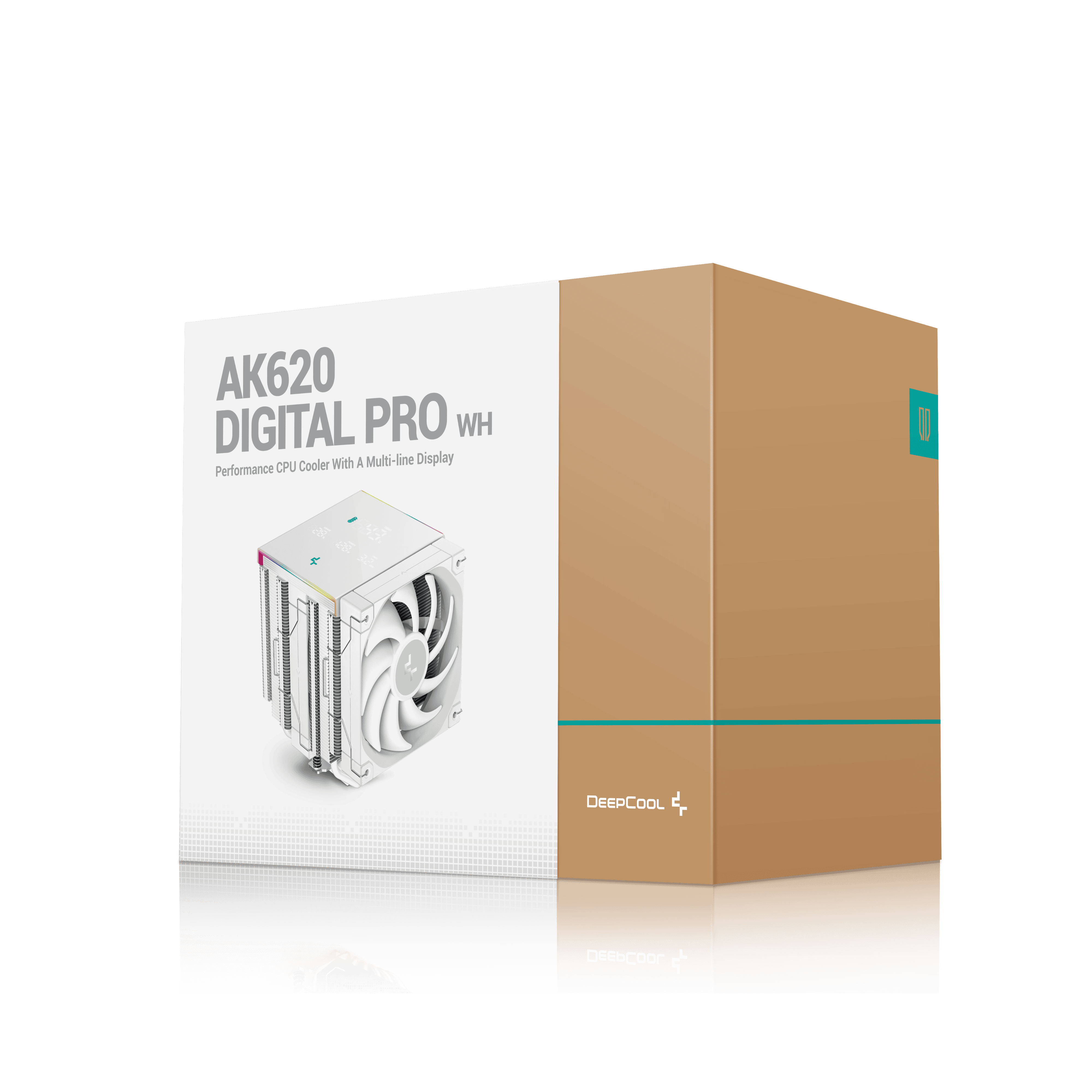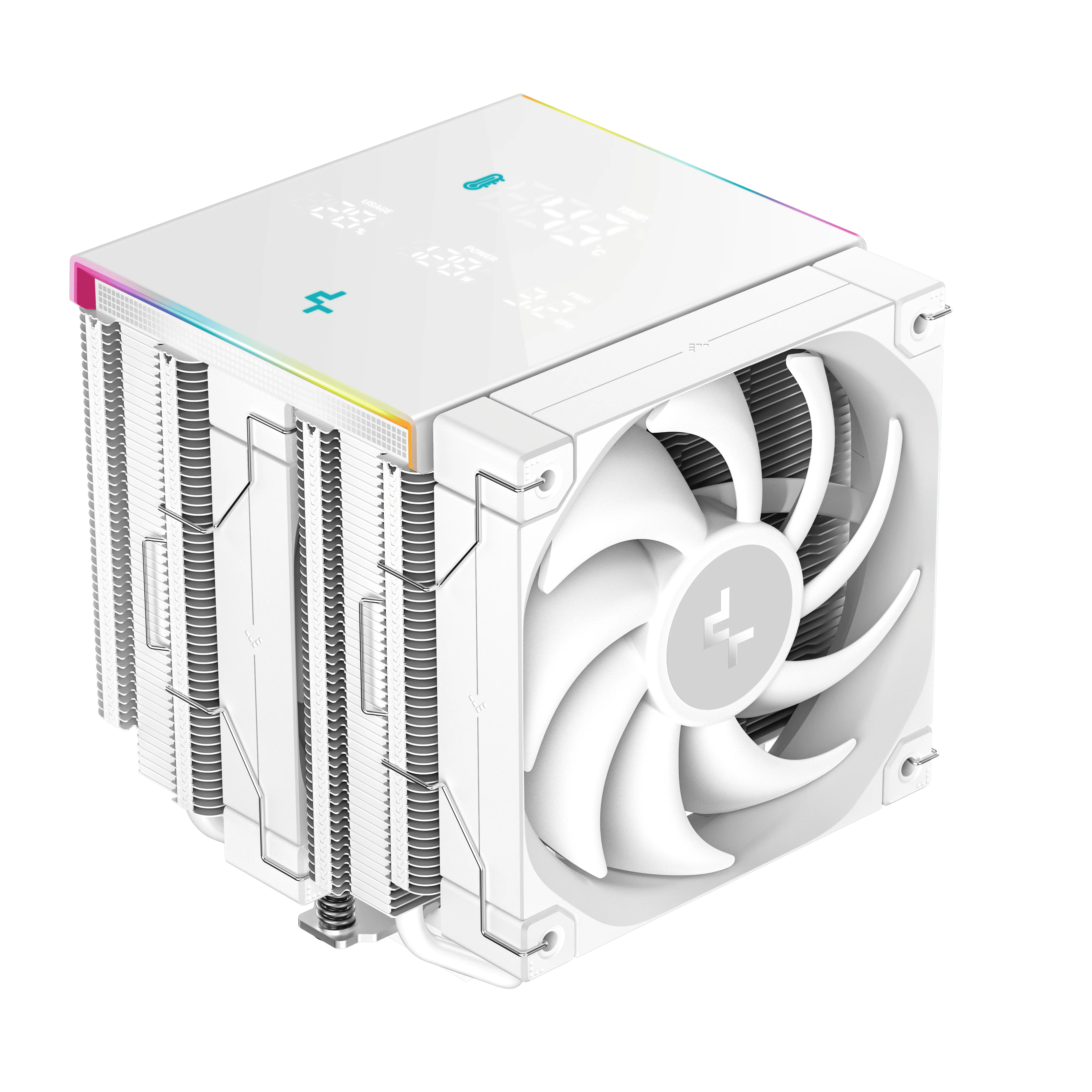 DEEPCOOL AK620 DIGITAL PRO WH Dual Tower ARGB CPU Air Cooler With Digital Screen : Temperature Alerts Digital Display ; ARGB Strips ; 60.89 CFM up to 1750 RPM ; 120mm Silent PWM Fan ; 6 Advanced Copper Heat Pipes ; Core Touch 2.0 | WHITE