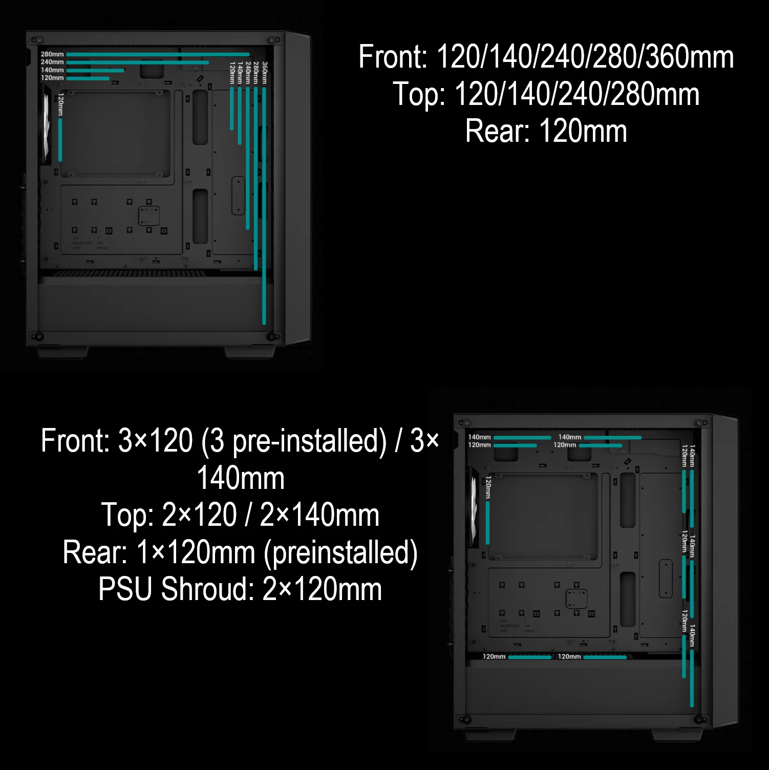 | Rear: 1×120mm, PSU Shroud: 2×120mm | |