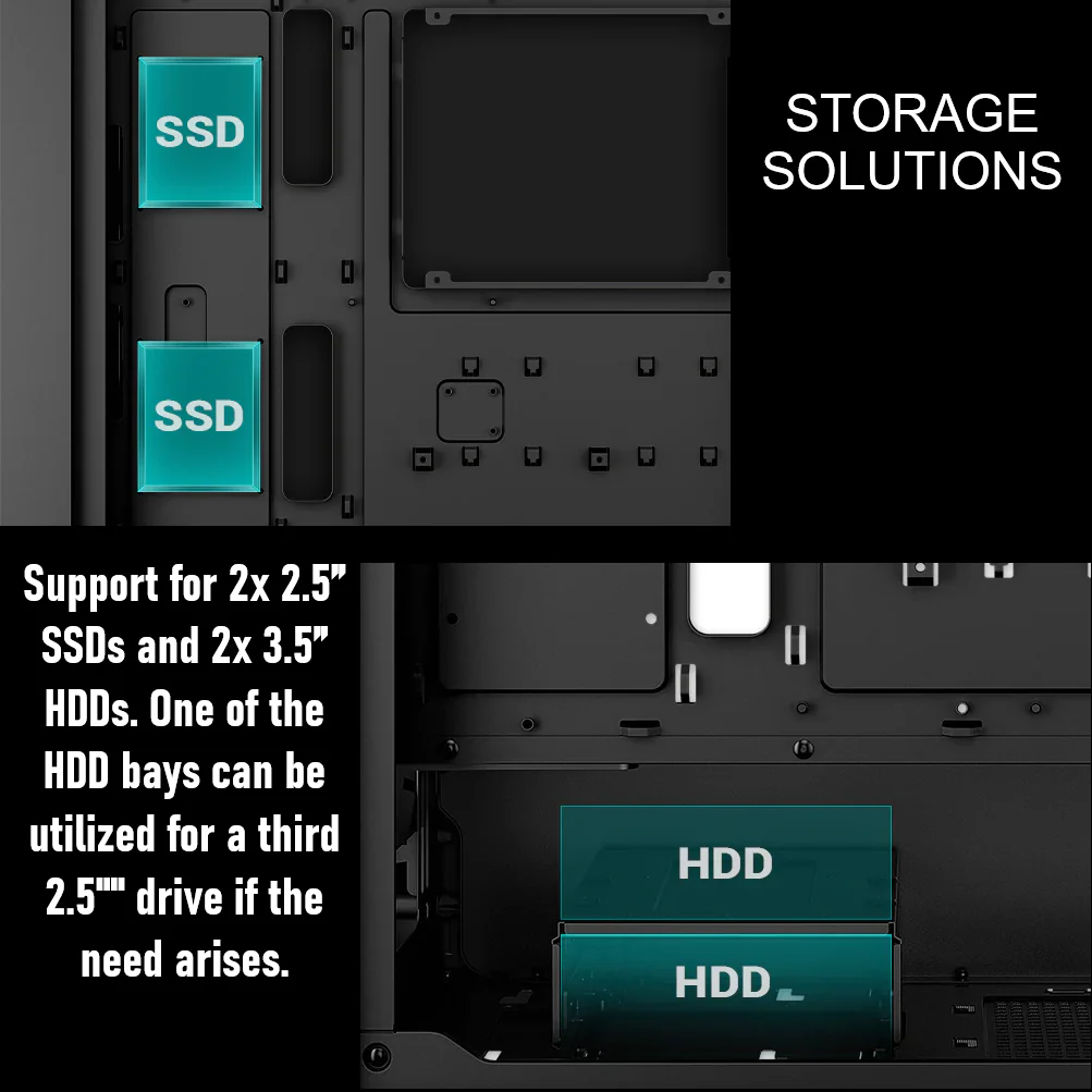 - Spacious Storage Layout: Houses 2x 3.5” HDDs and 2x 2.5” SSDs, with an extra slot to convert an HDD bay to SSD.
