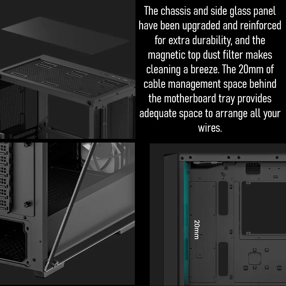 - Easy Cable Management: 20mm of dedicated space behind the motherboard tray for a clean build.