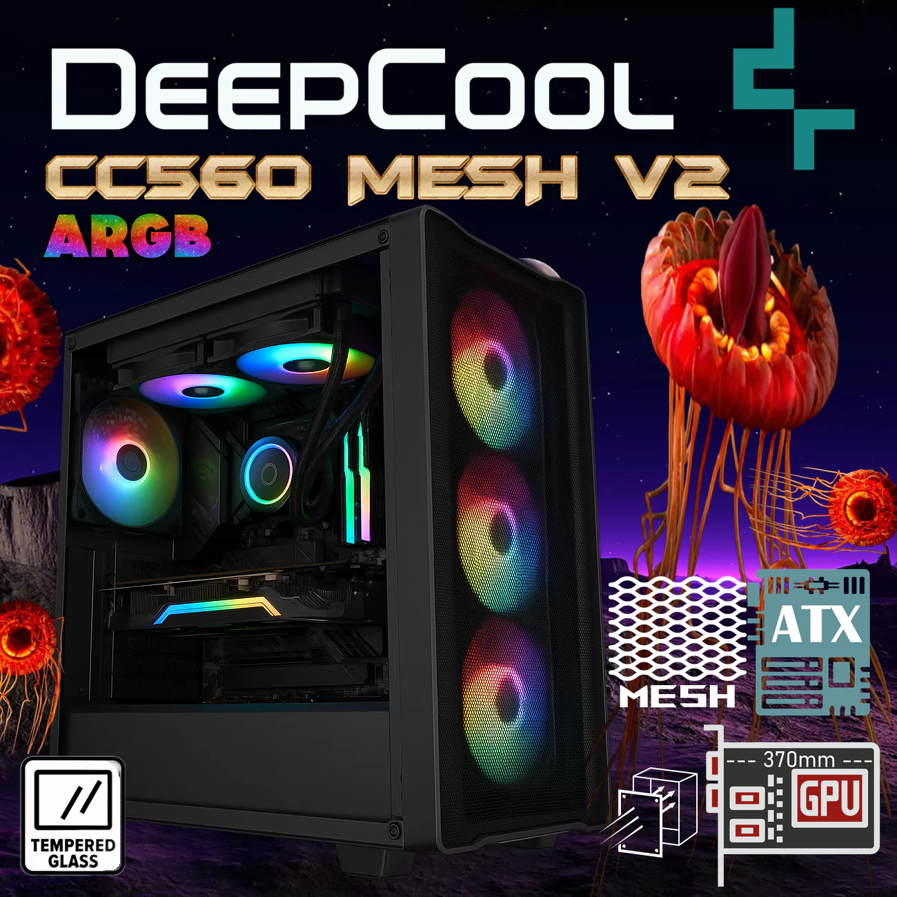 DeepCool CC560 Mesh V2 ATX Mid-Tower Case With 4 ARGB Fans, Tempered Glass Panel, Fine Mesh Front, Dual 120mm Fan Mounts on PSU Shroud , 360mm Radiator Support, GPU Up To 370mm, Dual USB 3.0 | BLACK