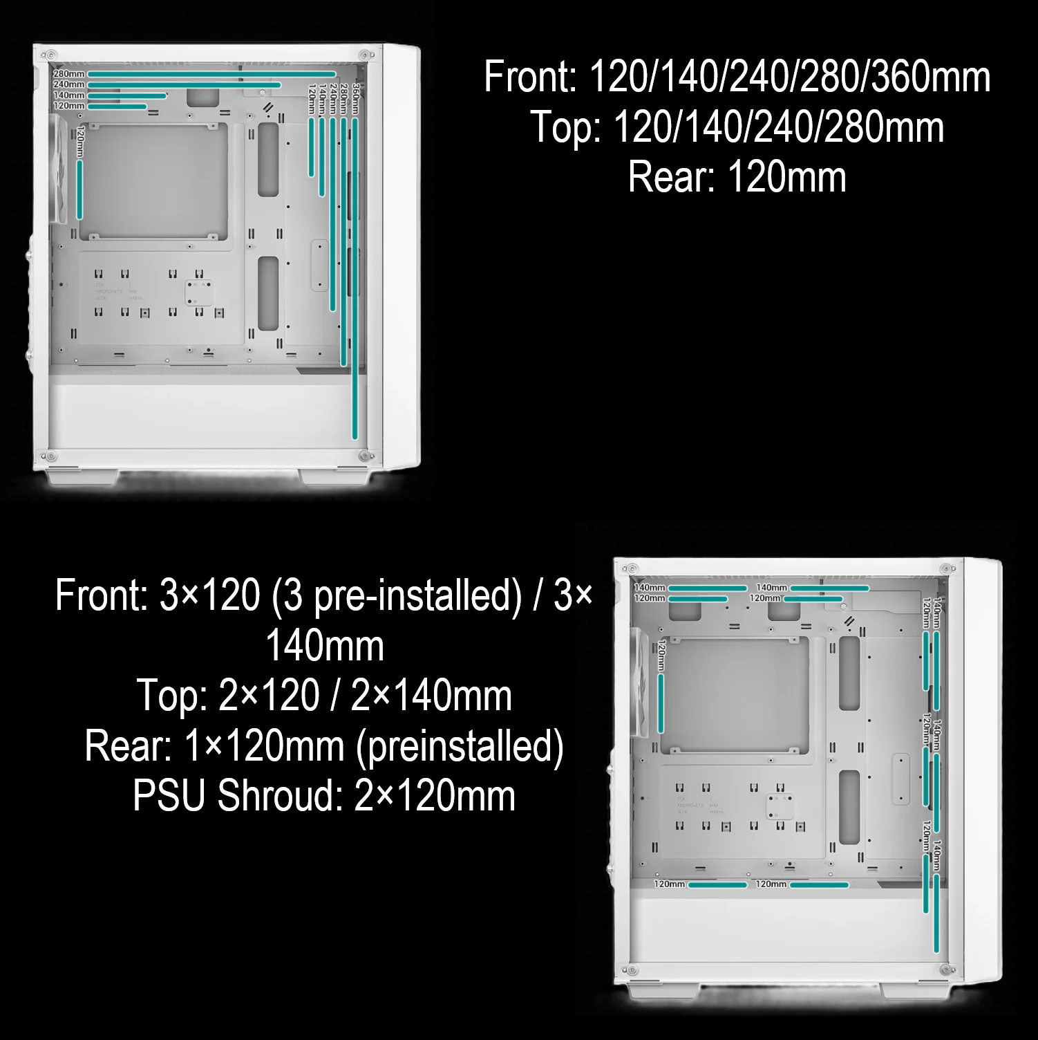| Fan Support | Front: 3×120mm/3×140mm, Top: 2×120mm/2×140mm |