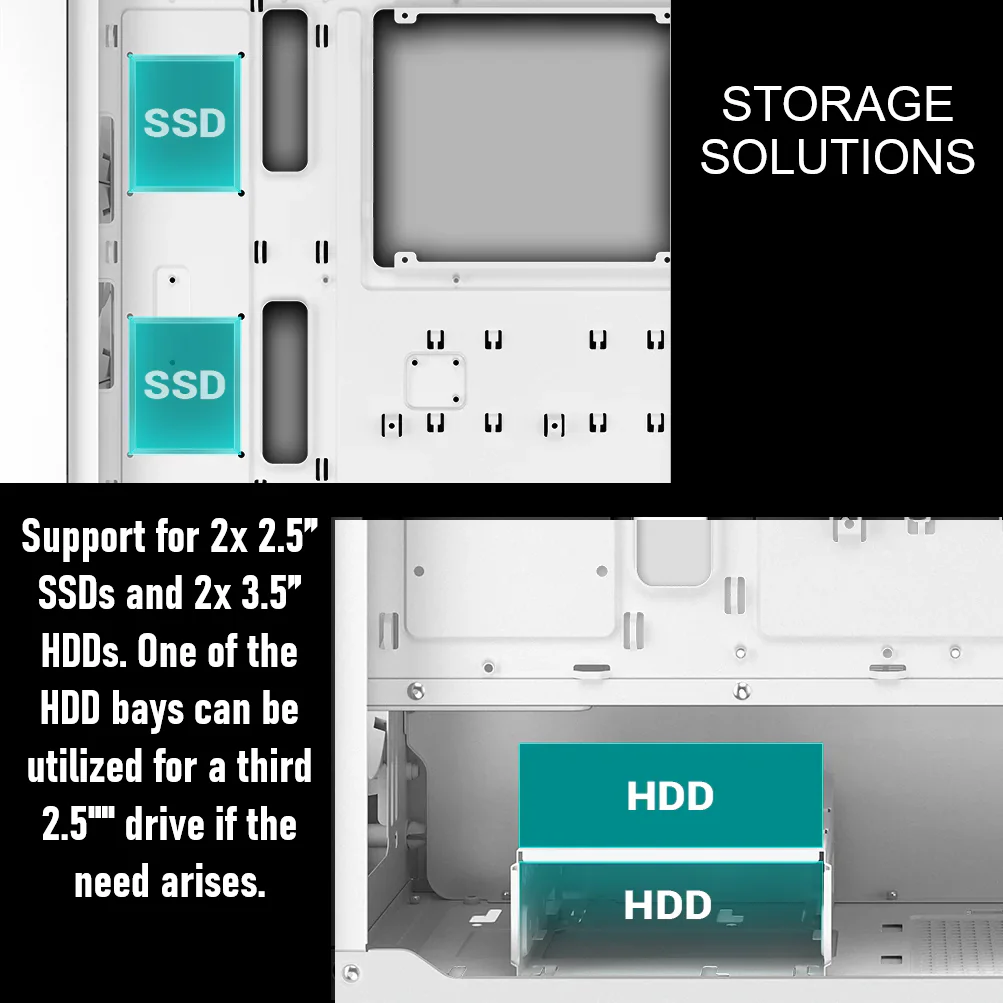 - Spacious Storage Layout: Houses 2x 3.5” HDDs and 2x 2.5” SSDs, with an extra slot to convert an HDD bay to SSD.