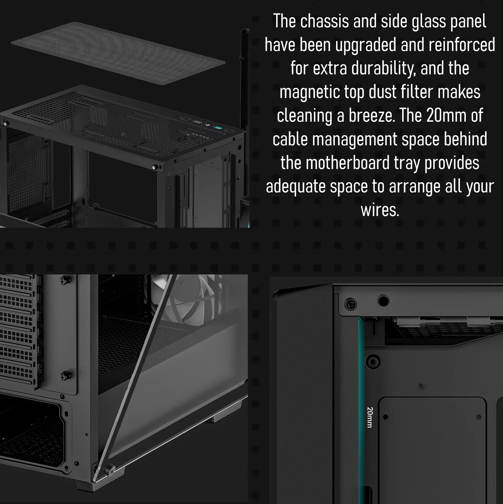 Magnetic top dust filter and 20mm cable management space behind the motherboard tray. - Top I/O Access