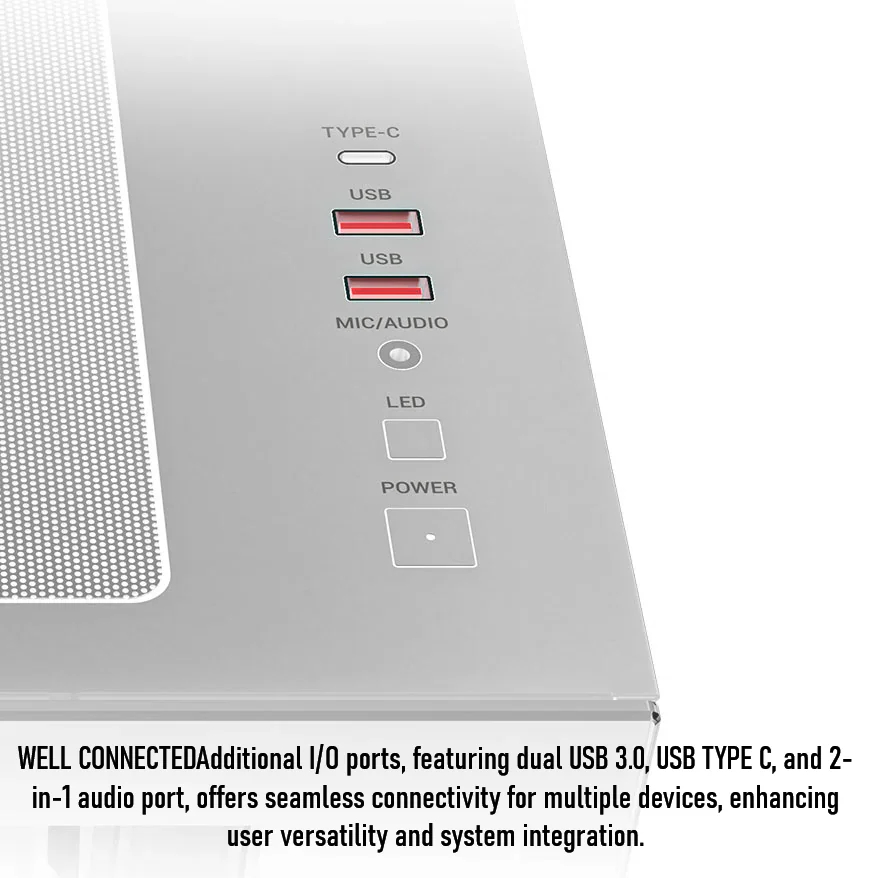 | Front I/O Ports | 2 × USB 3.0, 1 × USB-C Gen2, 1 × Audio/Mic Combo |