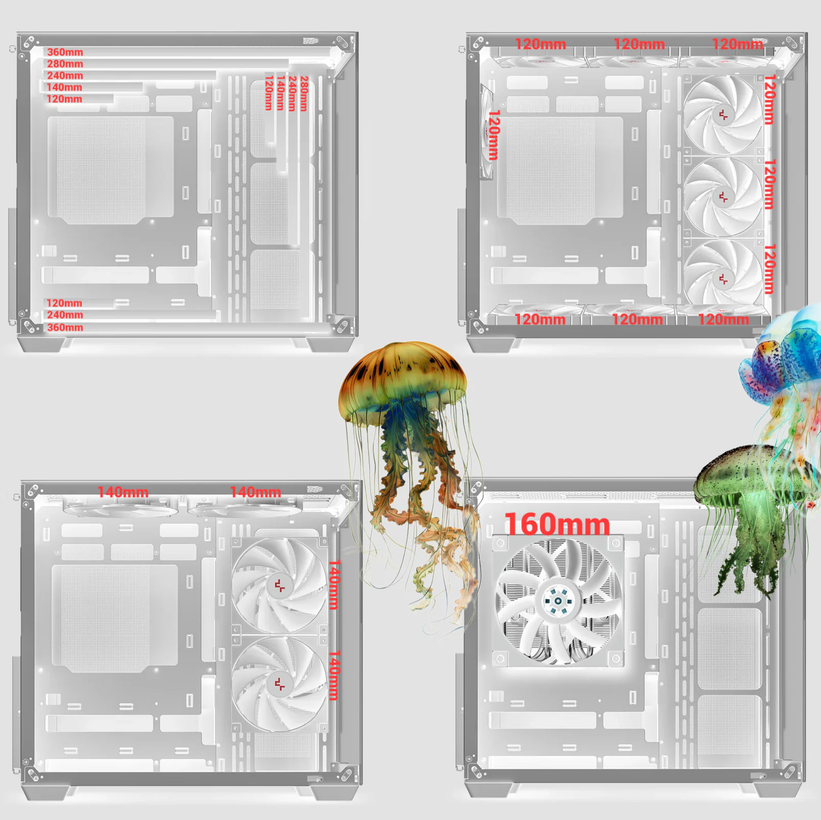 - Wide Cooling Support: Radiator support on top (up to 360mm), side (280mm), and bottom (360mm)—plus space for up to 9×120mm fans total. Airflow goals? Achieved.