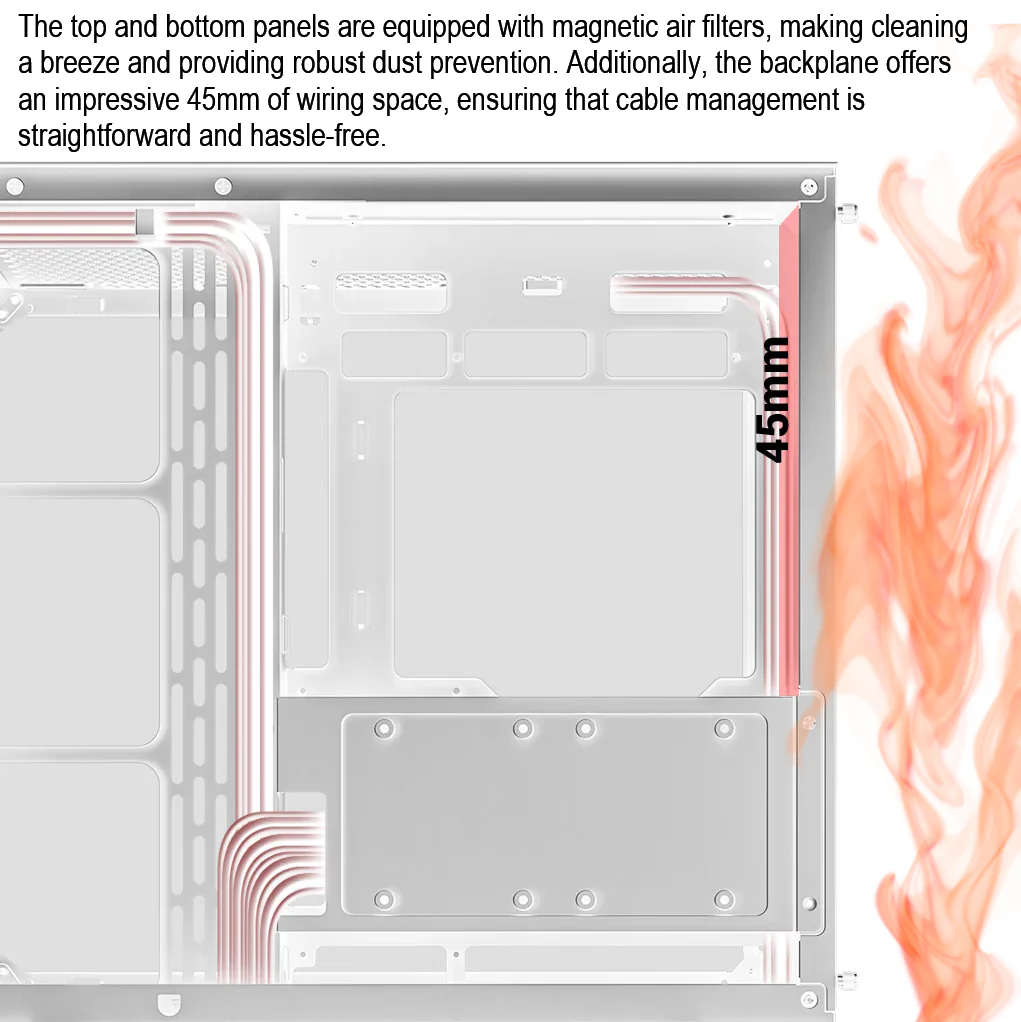 - Cable Management Made Elegant: 45mm of wiring clearance in the back = clean aesthetics, better airflow, zero stress.