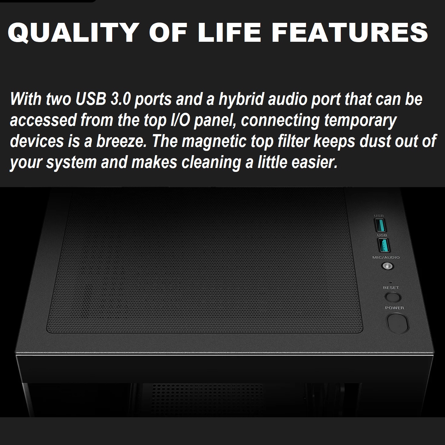 - Easy Connections: Two USB 3.0 ports and a hybrid audio port on the top I/O panel for quick device hookups.