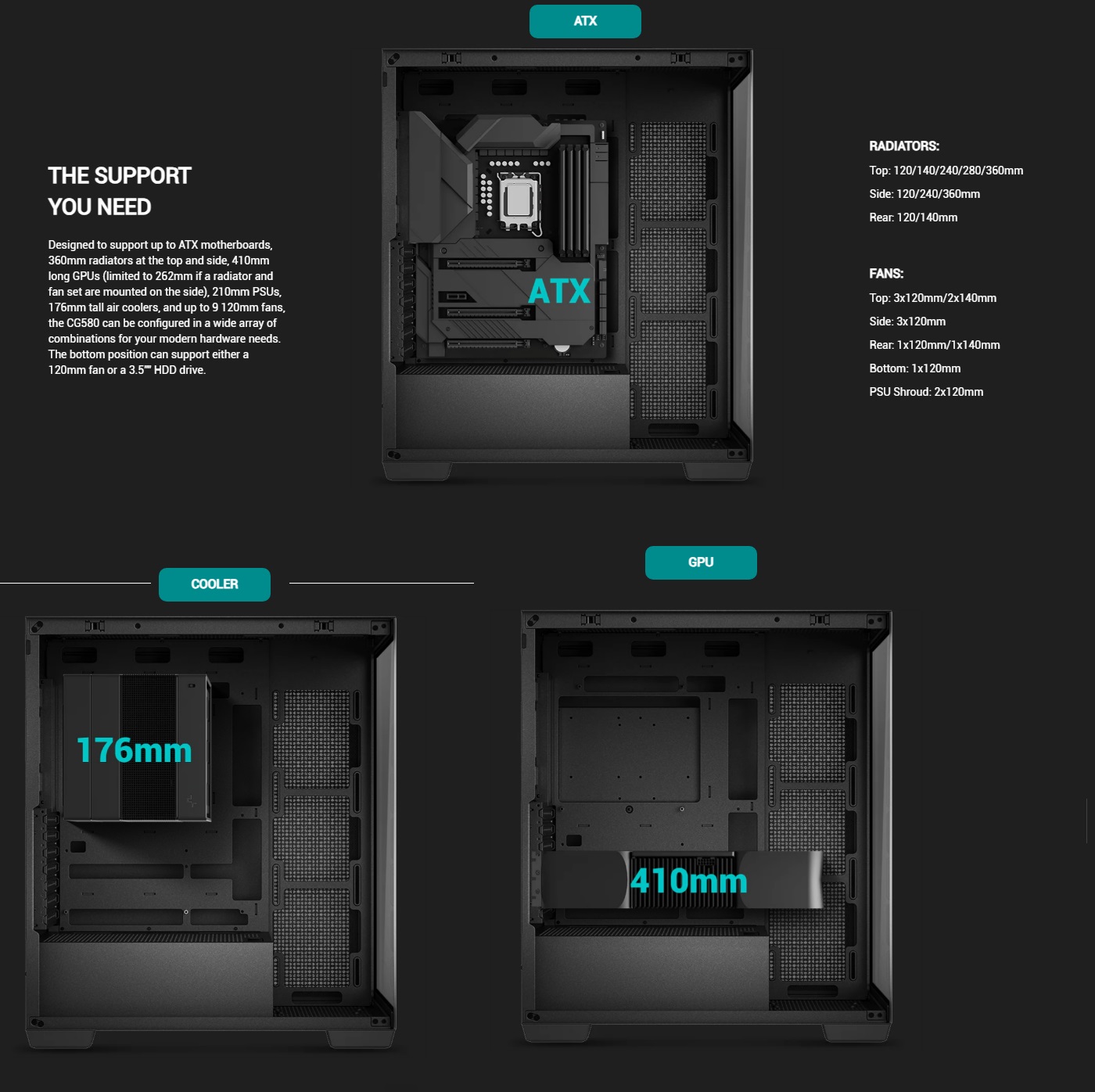 | GPU Length Limit | 410mm (limited to 262mm if a 360mm radiator and fan set are mounted on the side) |