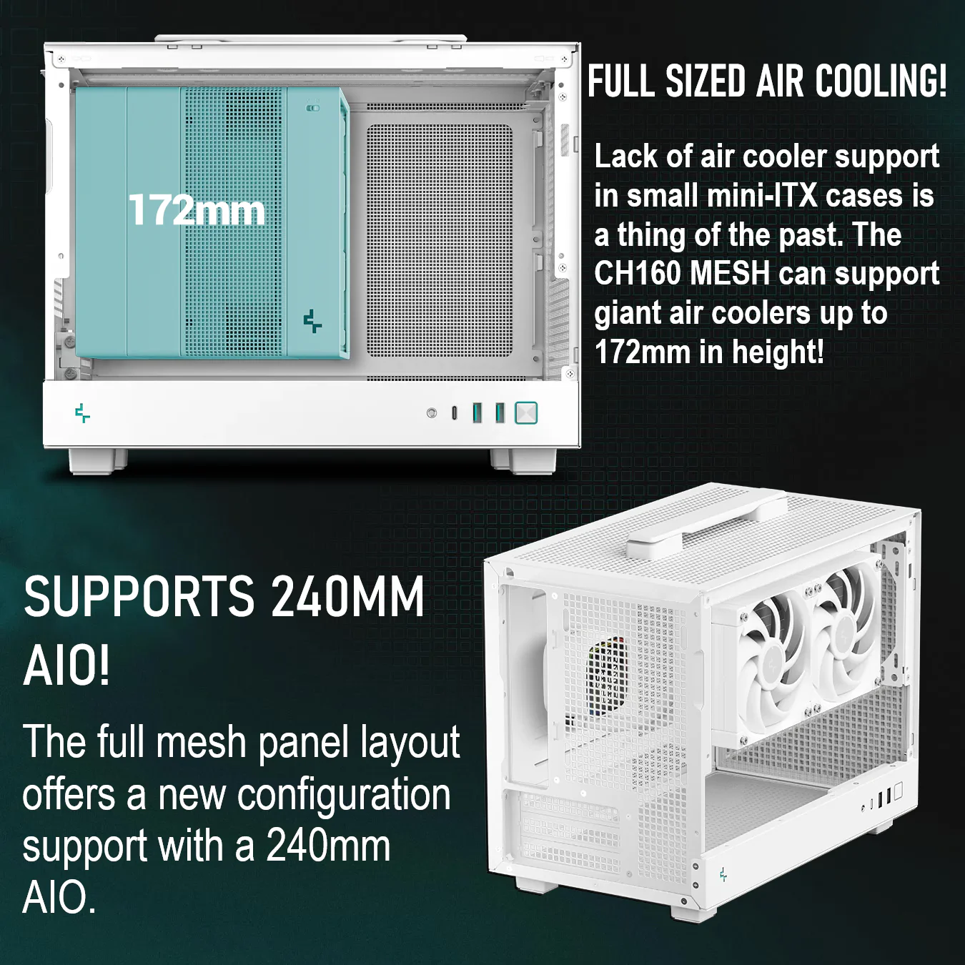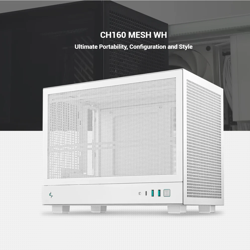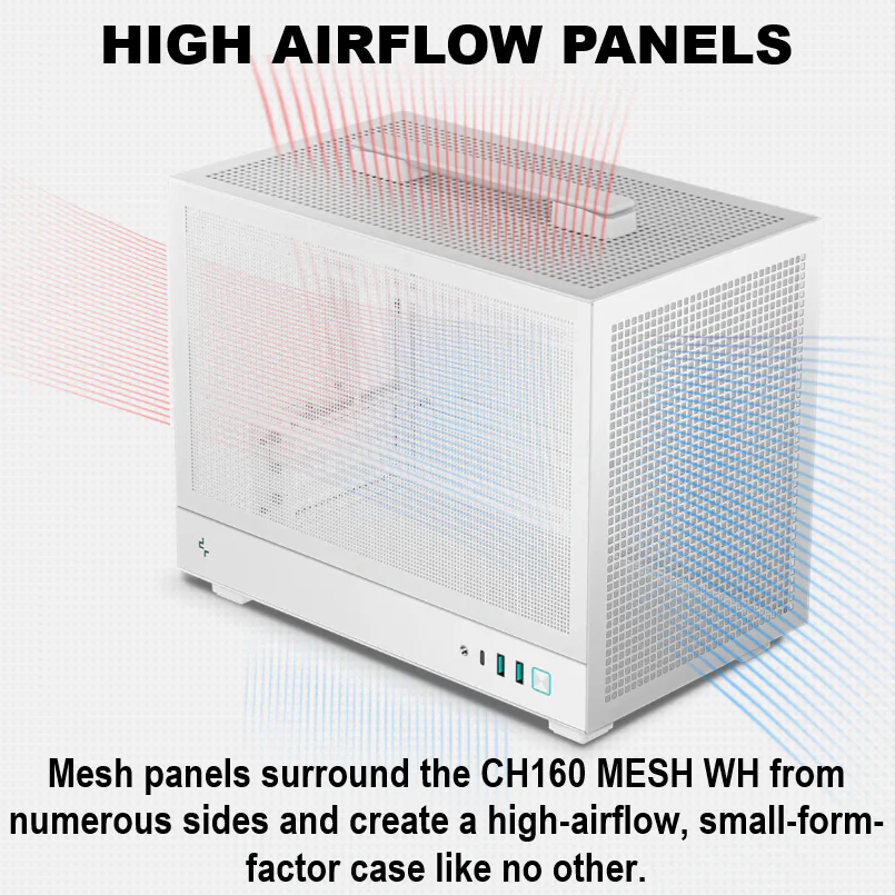 DeepCool CH160 MESH WH Mini-ITX Case with High-Airflow Mesh Panels ; Supports 240mm AIO ,Fits 3-Slot GPUs , ATX/SFX PSU Compatible , Sturdy Handle & Gen2 Type-C | WHITE