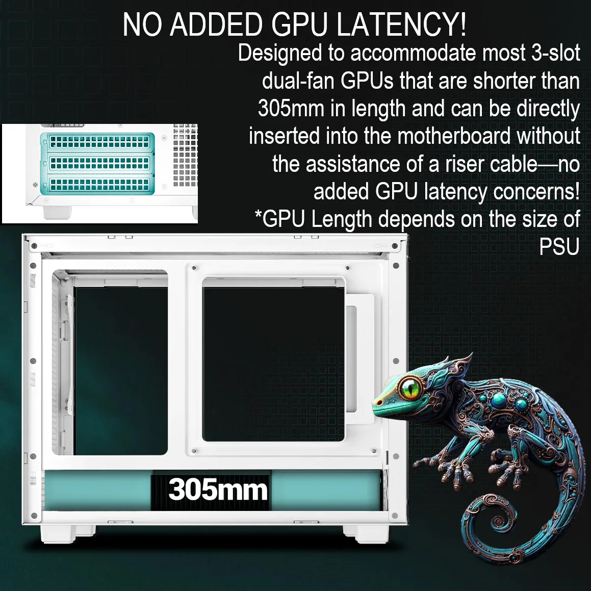 - No GPU Latency – Direct GPU insertion without a riser cable; supports 3-slot GPUs up to 305mm (SFX PSU) or 230mm (ATX PSU).