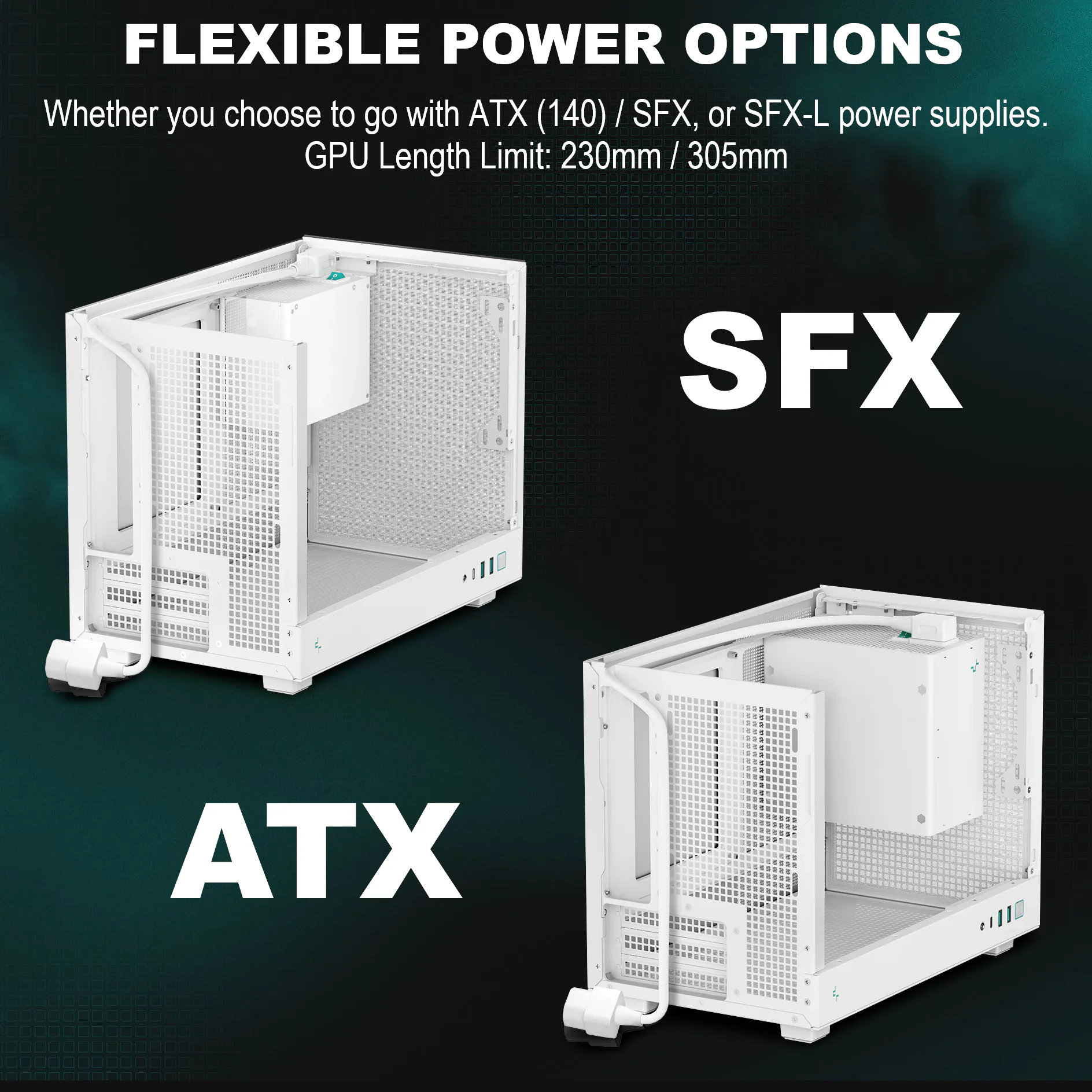 - Flexible PSU Options – Compatible with ATX (140mm), SFX, and SFX-L power supplies.