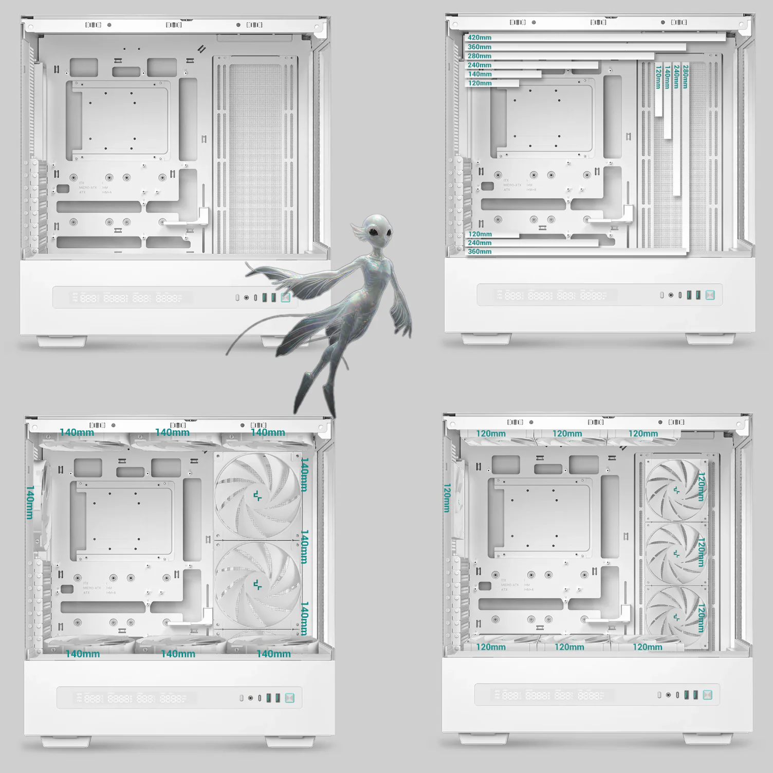 - Cooling Beast: Supports massive radiators up to 420mm (top), 360mm (bottom), and 280mm (side), plus up to 10 fans across the case.