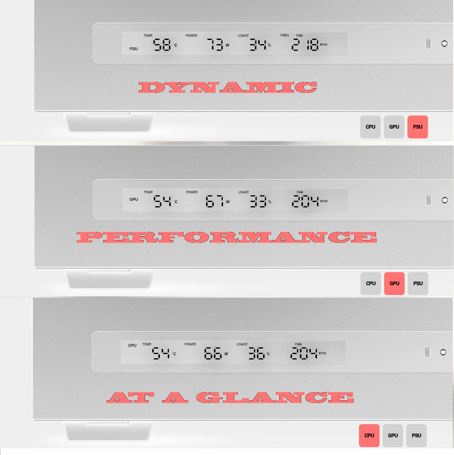 - Digital Dashboard Monitoring: Real-time system stats display for CPU, GPU, and PSU – shows temps (°C/°F), usage, wattage, frequency, and even fan speeds.