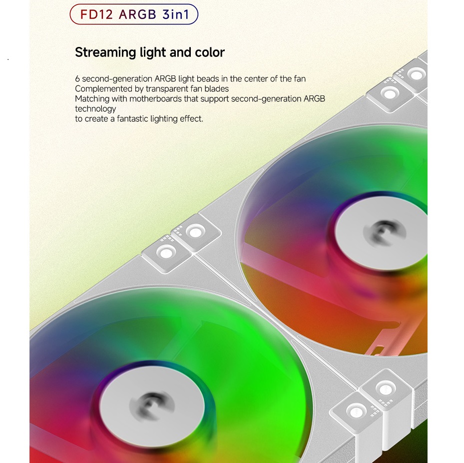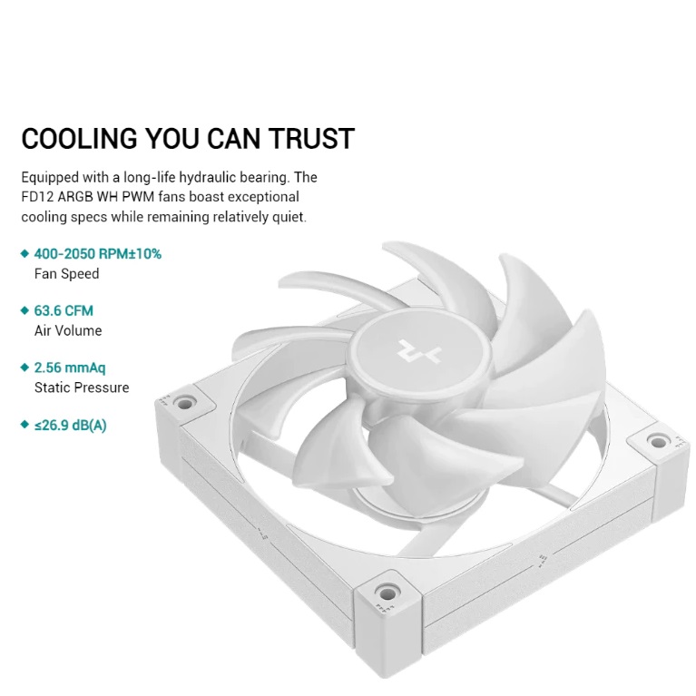 DeepCool FD12 ARGB Single WHITE Case Fan 120mm ;Hydro Bearing Tech High Speed 2050 RPM 63.6 CFM ; 1.56 W Power-Efficient ; 3-pin (+5V-D-G) LED @ 5V DC ; Addressable RGB Fans with Daisy Chain Connectors | 1 PCS WHITE