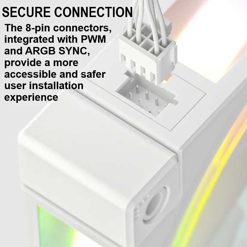 🔌 CLEAN & SECURE CONNECTION : Each fan uses a tidy 8-pin daisy-chain connector for both PWM control and ARGB syncing, making cable management less of a horror movie.