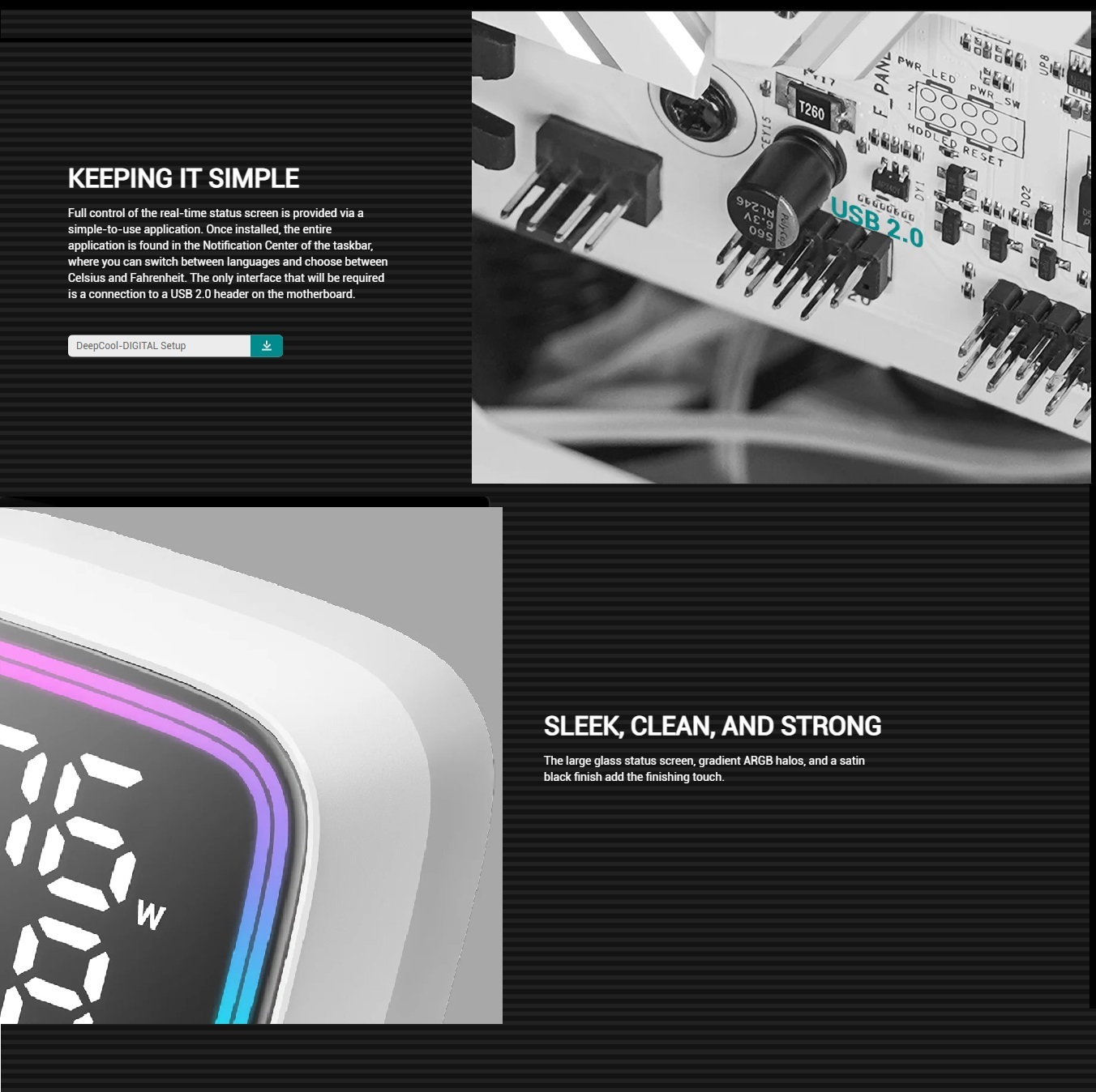 - Simplified Control Interface: Manage the real-time status screen effortlessly via an intuitive application accessible from the taskbar’s Notification Center. Users can toggle between languages and temperature units (Celsius/Fahrenheit) with ease. Connection to a USB 2.0 header on the motherboard is the only requirement.