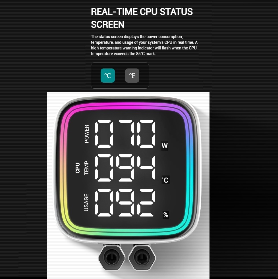 - Real-Time CPU Status Screen: The integrated status display provides instantaneous feedback on CPU power consumption, temperature, and utilization. An alert system activates a high-temperature warning when CPU temperatures exceed 85°C.