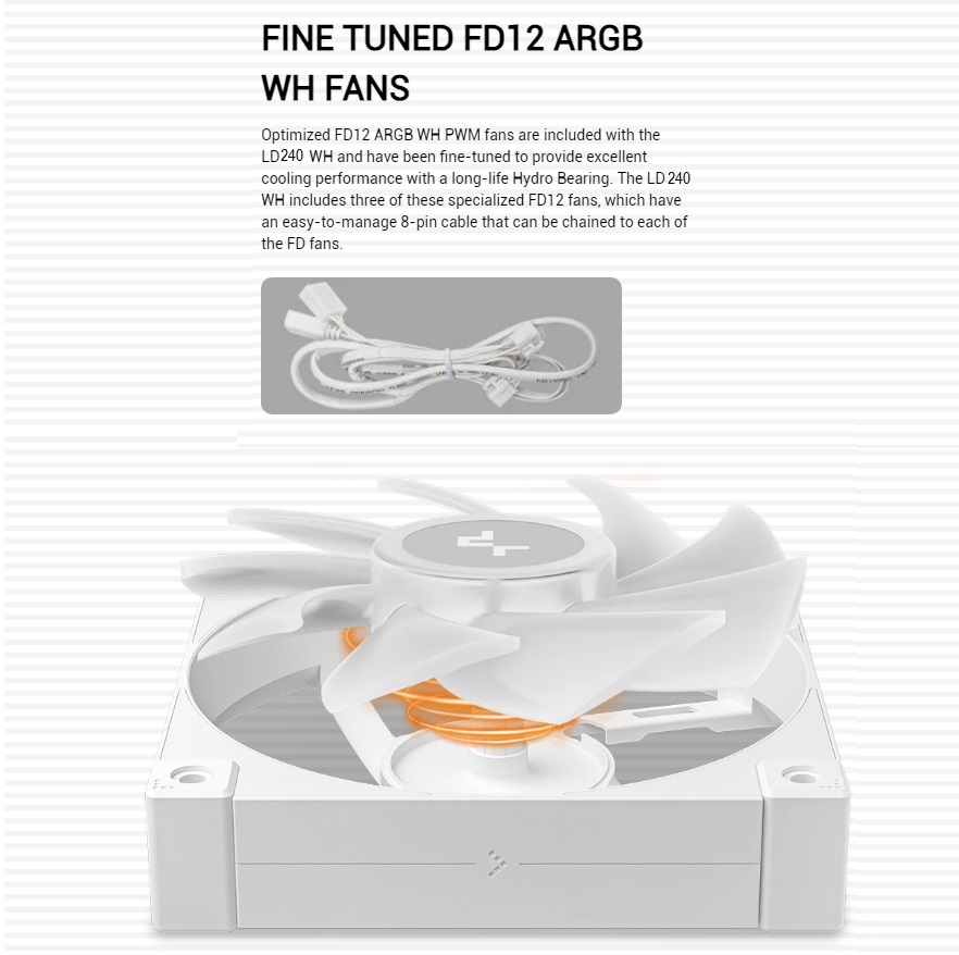 - Optimized FD12 ARGB PWM Fans: Included are two meticulously fine-tuned FD12 ARGB PWM fans, designed for superior cooling efficiency and longevity, featuring a Hydro Bearing. These fans come with user-friendly 8-pin cables for easy daisy-chaining.