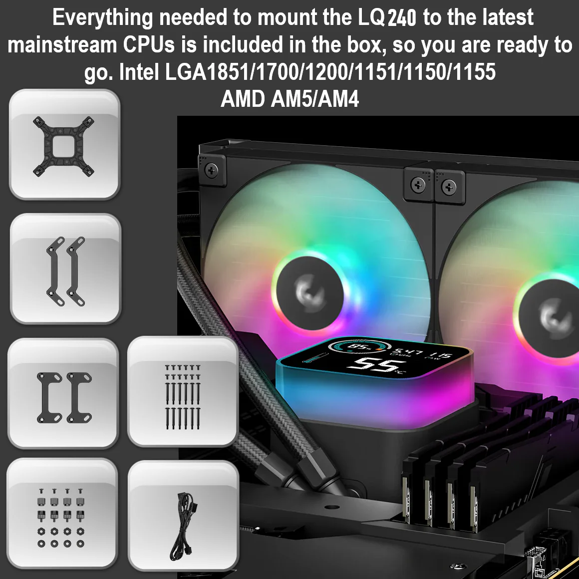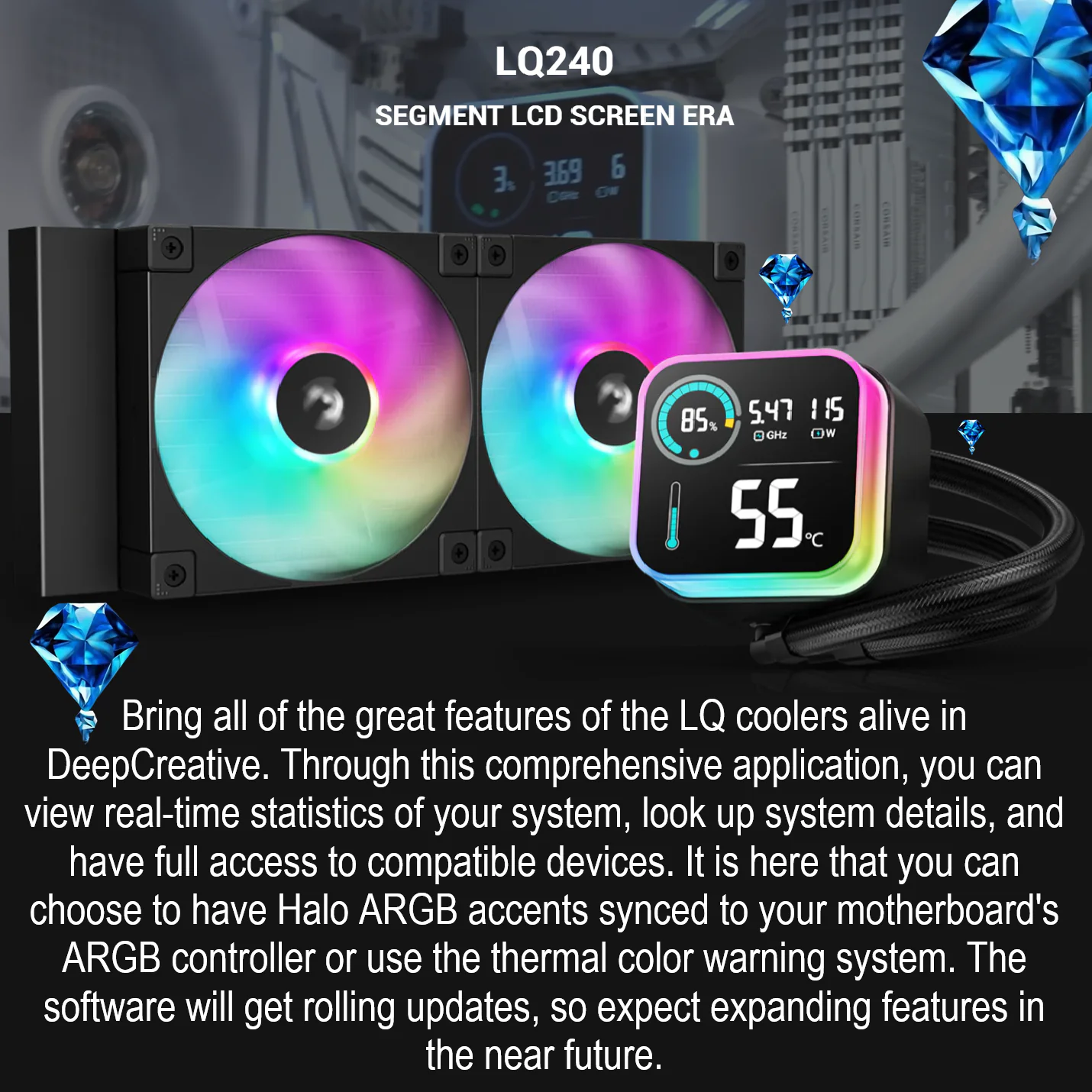 - Segment LCD Screen for Real-Time Monitoring: The LQ240 steps into the Segment LCD ERA with a sleek digital display showing CPU usage, temperature, frequency, and TDP—all in real time.