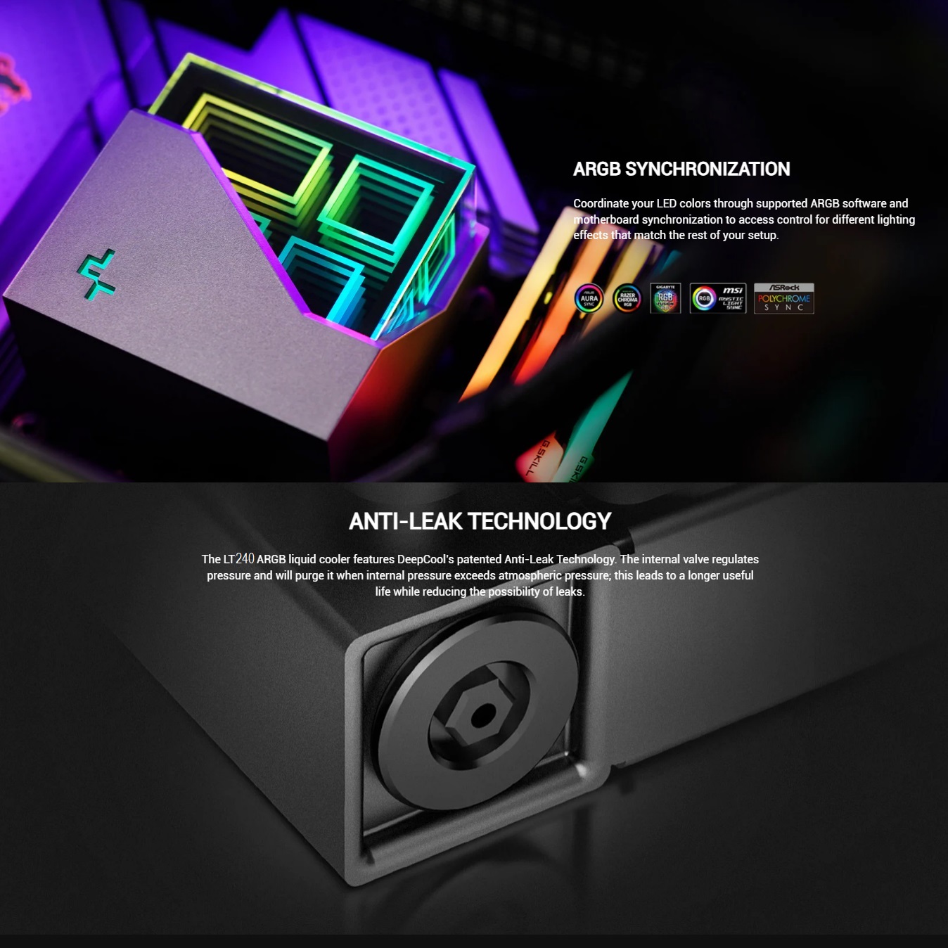 DeepCool LT240 ARGB AIO LIQUID COOLER : Infinity Mirror Frosty Cube with Copper Coldplate – 3400 RPM 5th Generation Water Pump – 2x 120mm ARGB PWM Fans – Intel and AMD Compatibility | BLACK