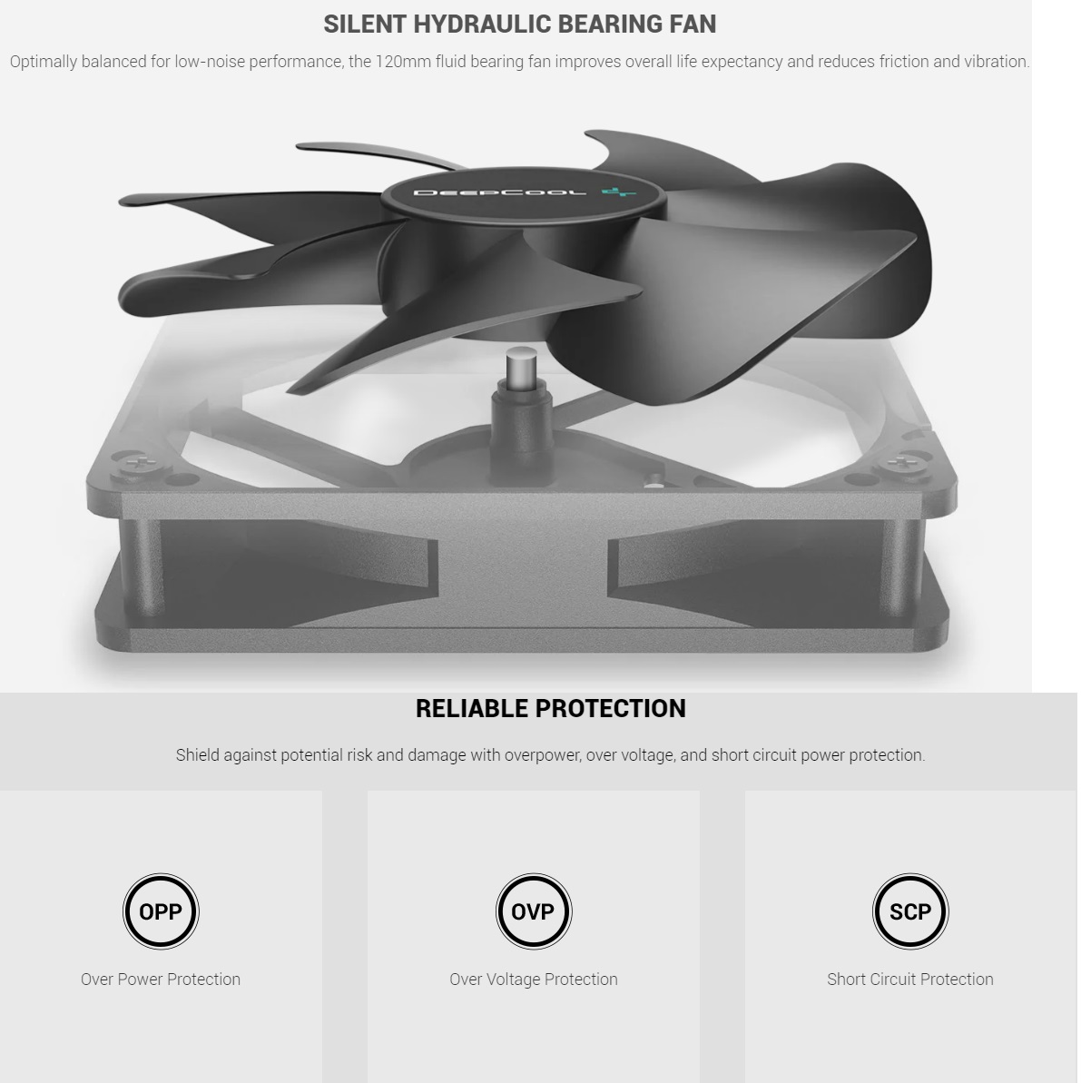 - 120mm fluid bearing fan for improved life expectancy, reduced friction, and vibration