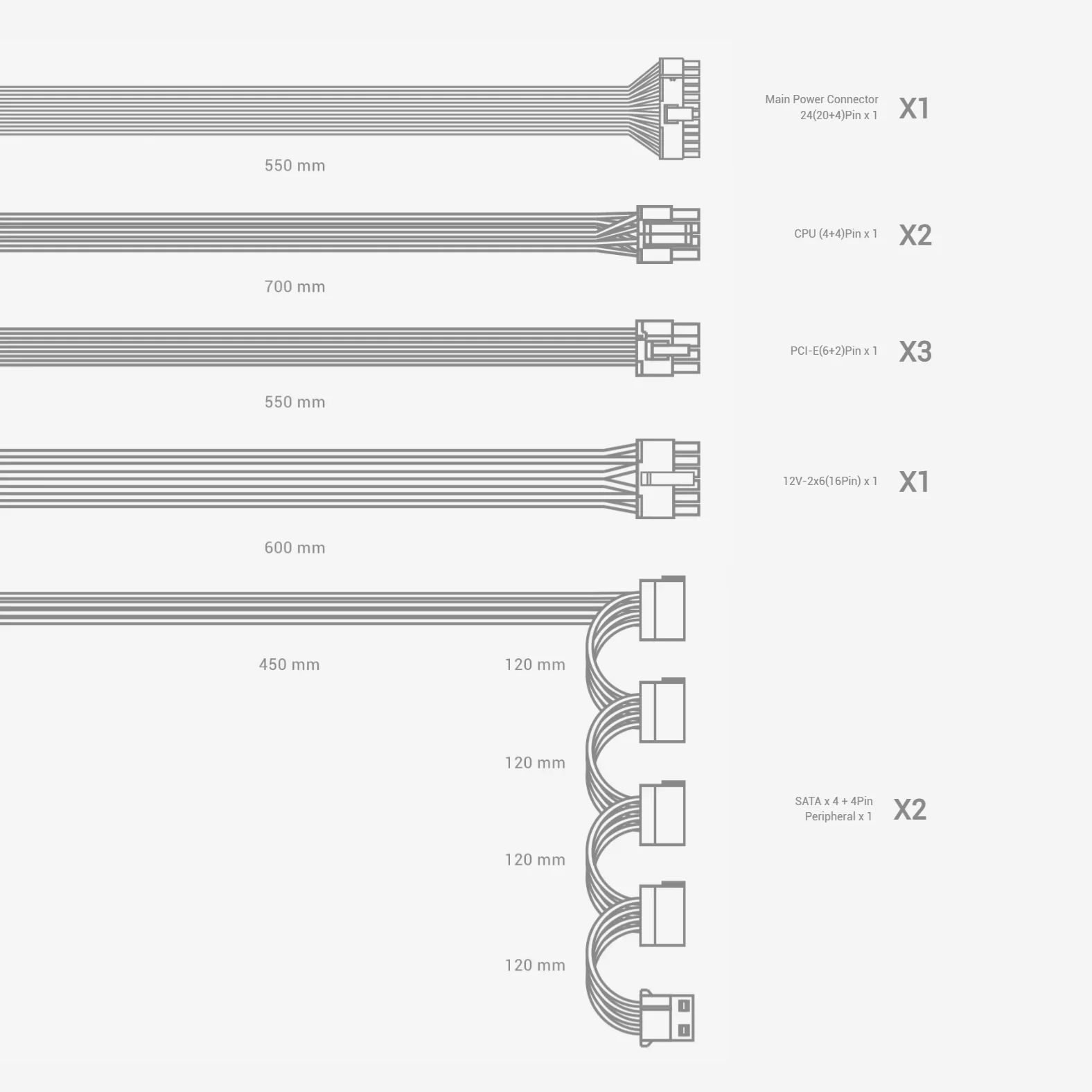 | Main Connectors | 24-pin x1, EPS 8-pin x2, PCIe 8-pin x3, 12V-2×6 x1 |
