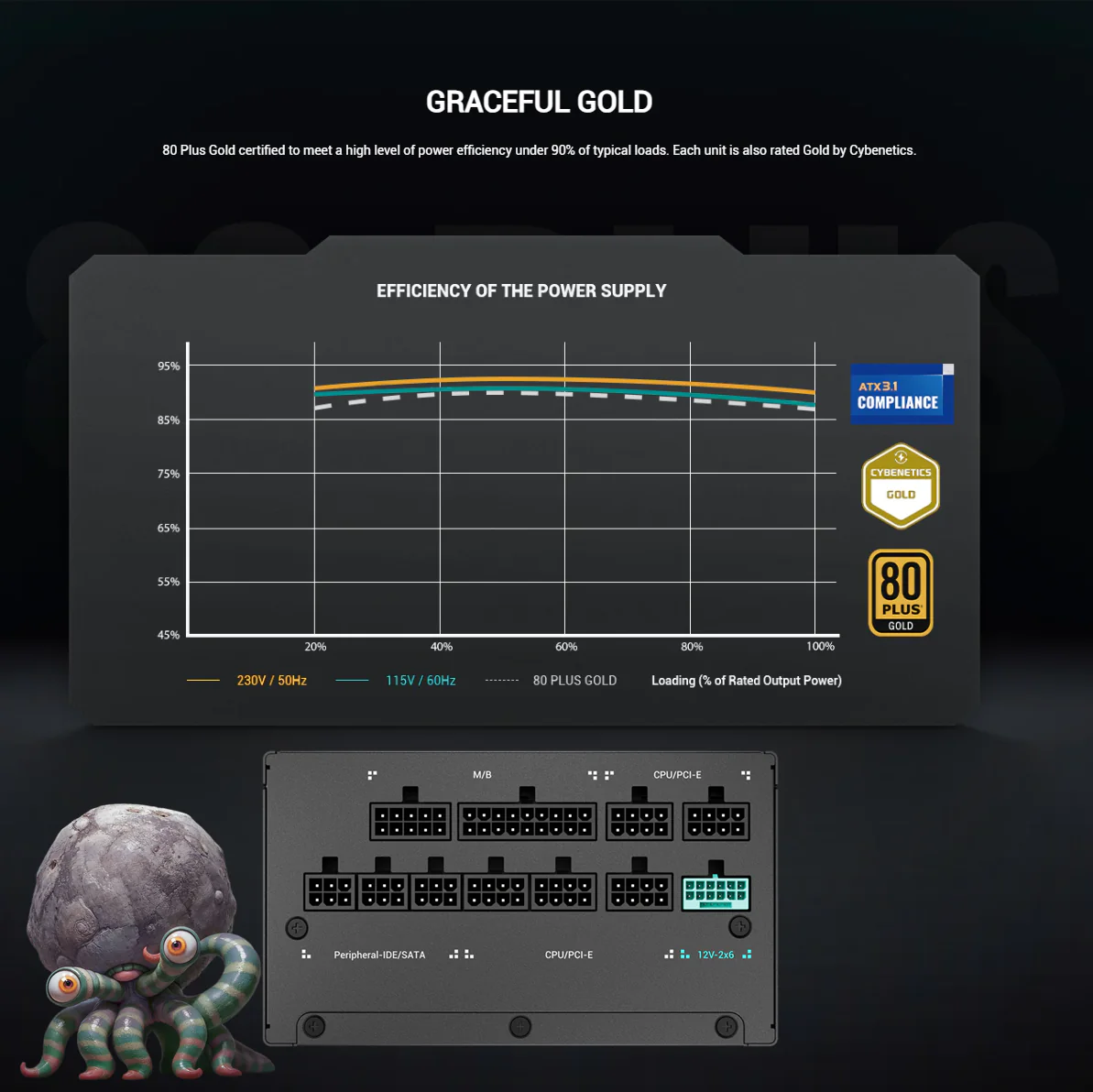 - Gracefully Gold Certified: 80 Plus Gold & Cybenetics Gold certified to deliver 90% efficiency under typical loads—less waste, more watts.