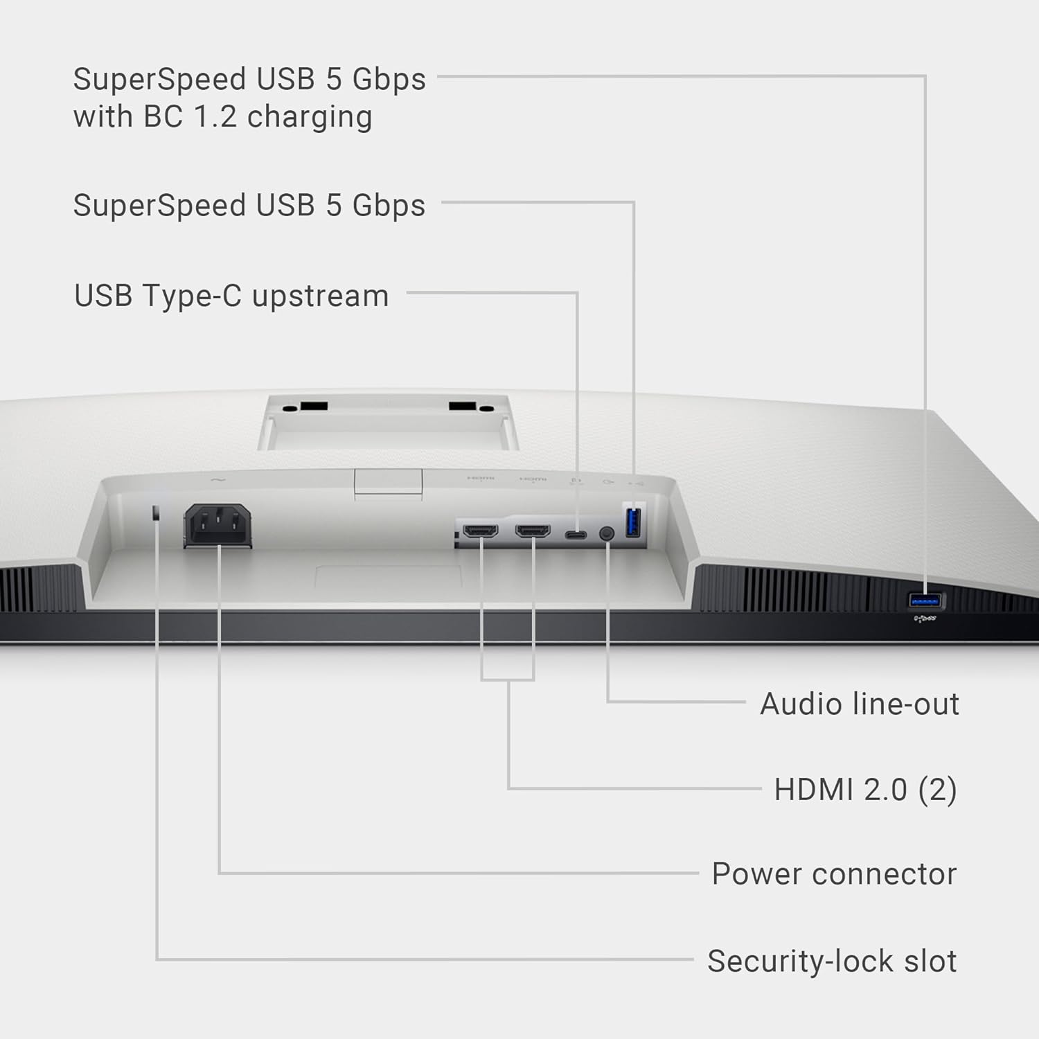 - Ports & Slots: Security-lock slot, power connector, HDMI 2.0 ports (2), USB Type-C upstream port, audio line-out port, SuperSpeed USB 5 Gbps (USB 3.2 Gen 1) Type-A port, speakers (2), SuperSpeed USB 5 Gbps (USB 3.2 Gen 1) with BC 1.2 charging.