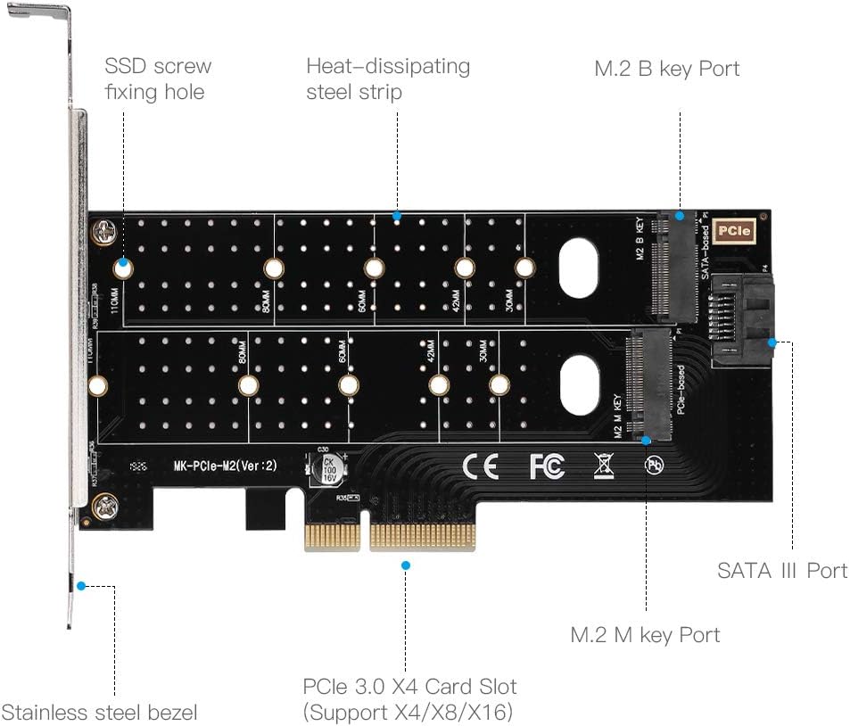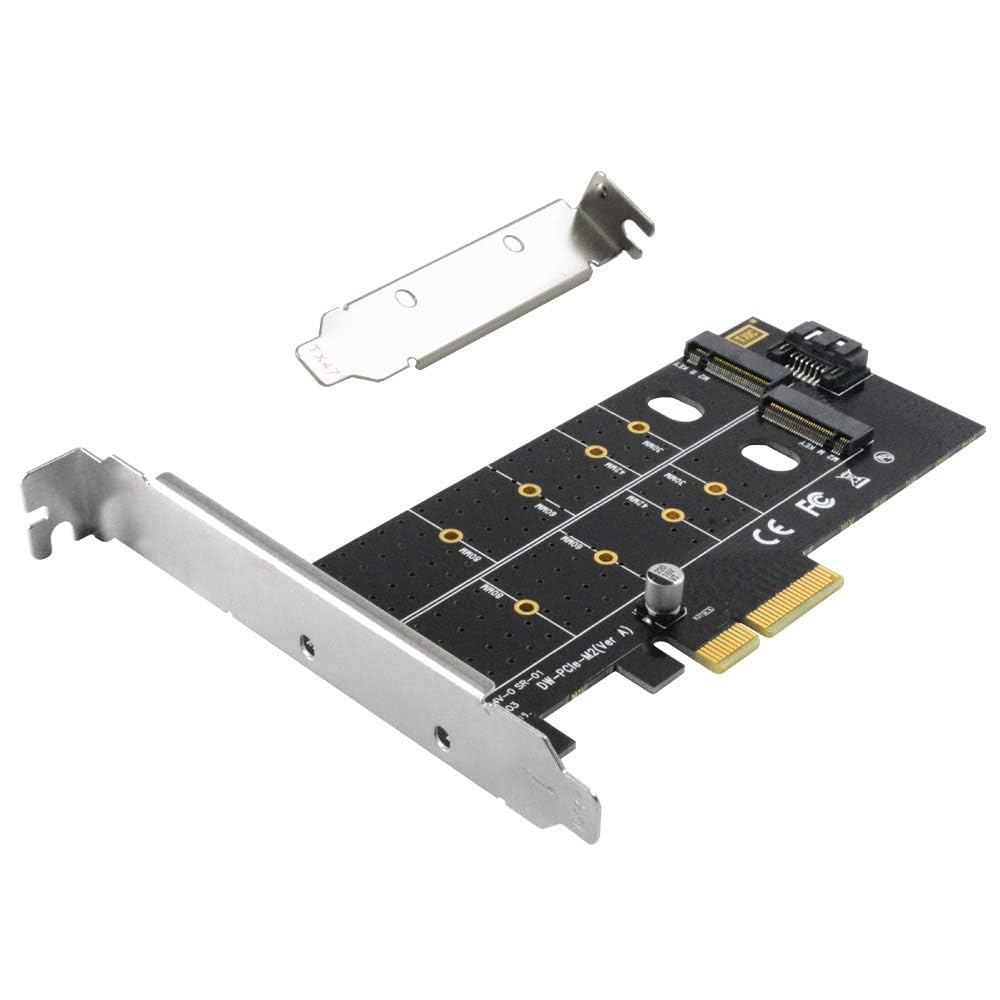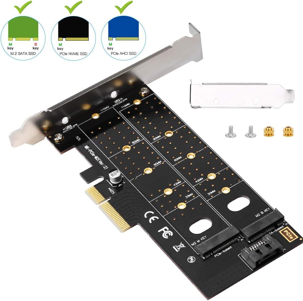 Dual M.2 PCIe Adapter, NGFF PCI-e 3.0 x 4 to SATA or PCIE NVMe SSD Expansion Card Support NVME (m Key) or SATA (b Key) 22110/ 2280/ 2260/ 2242 /2230 Host Controller Express Card | PCIE-DUAL-NVME