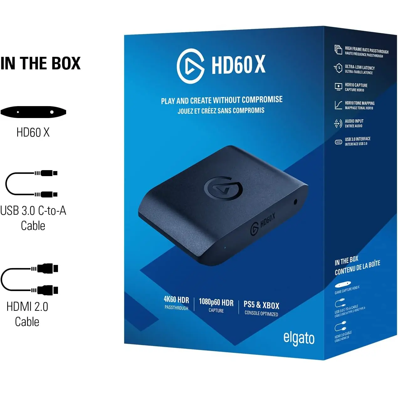 - In the Box: HD60 X, USB 3.0 C-to-A Cable, HDMI 2.0 Cable