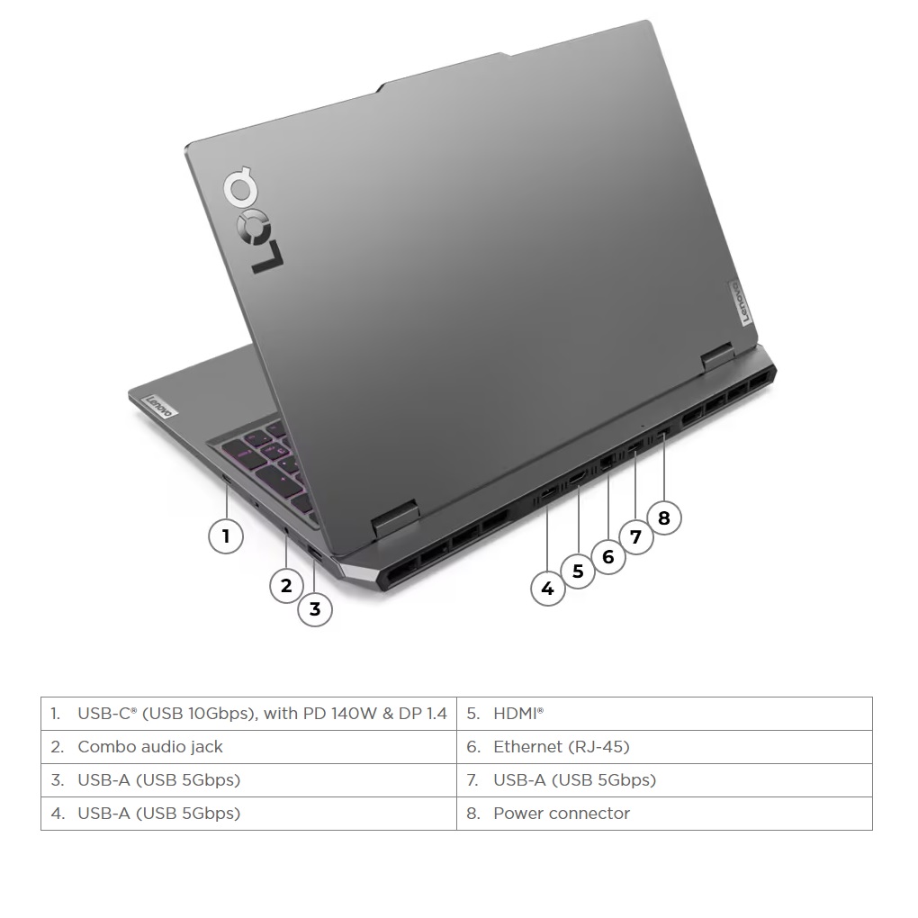 1x USB-C® (USB 10Gbps / USB 3.2 Gen 2), with Lenovo® PD 140W and DisplayPort™ 1.4