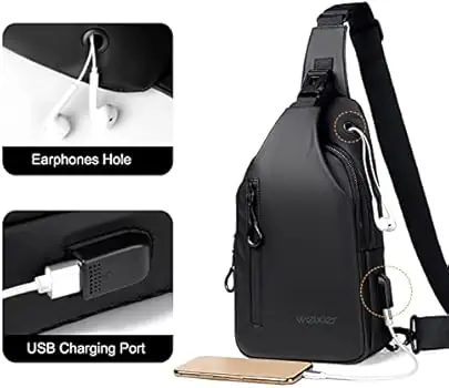EZ EXP034 SLING BAG: Waterproof Crossbody Daypack with USB Port, Slim Wallet Pocket, Unisex, Multi-Use for Travel, Cycling, Work | BLACK