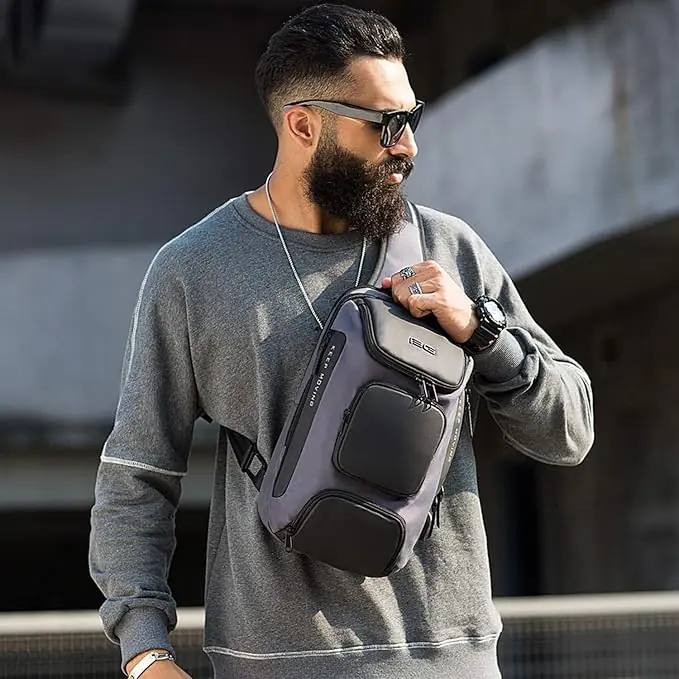 EZ W005 Sling Bag 15.6″ – Crossbody Shoulder Backpack with USB Port, Anti-Theft Pocket, Water-Resistant Polyester – Grey + Black