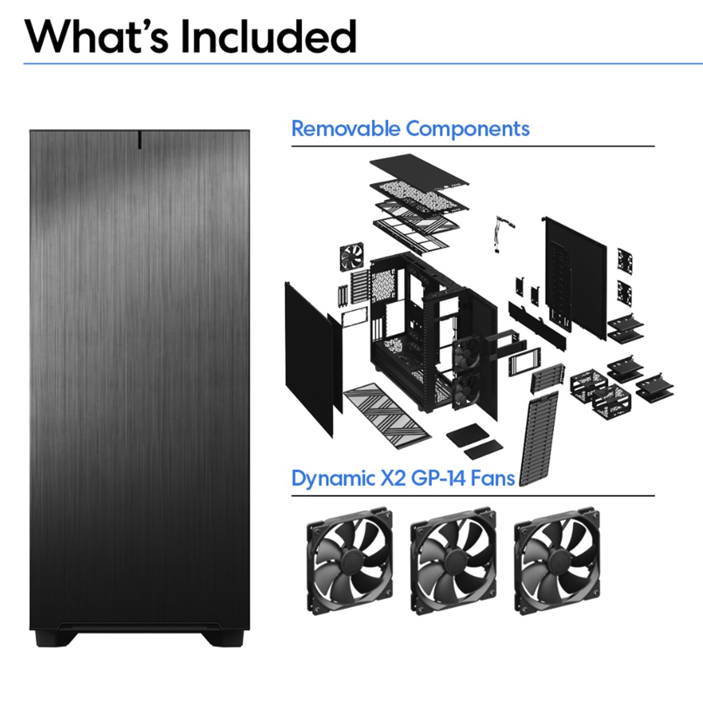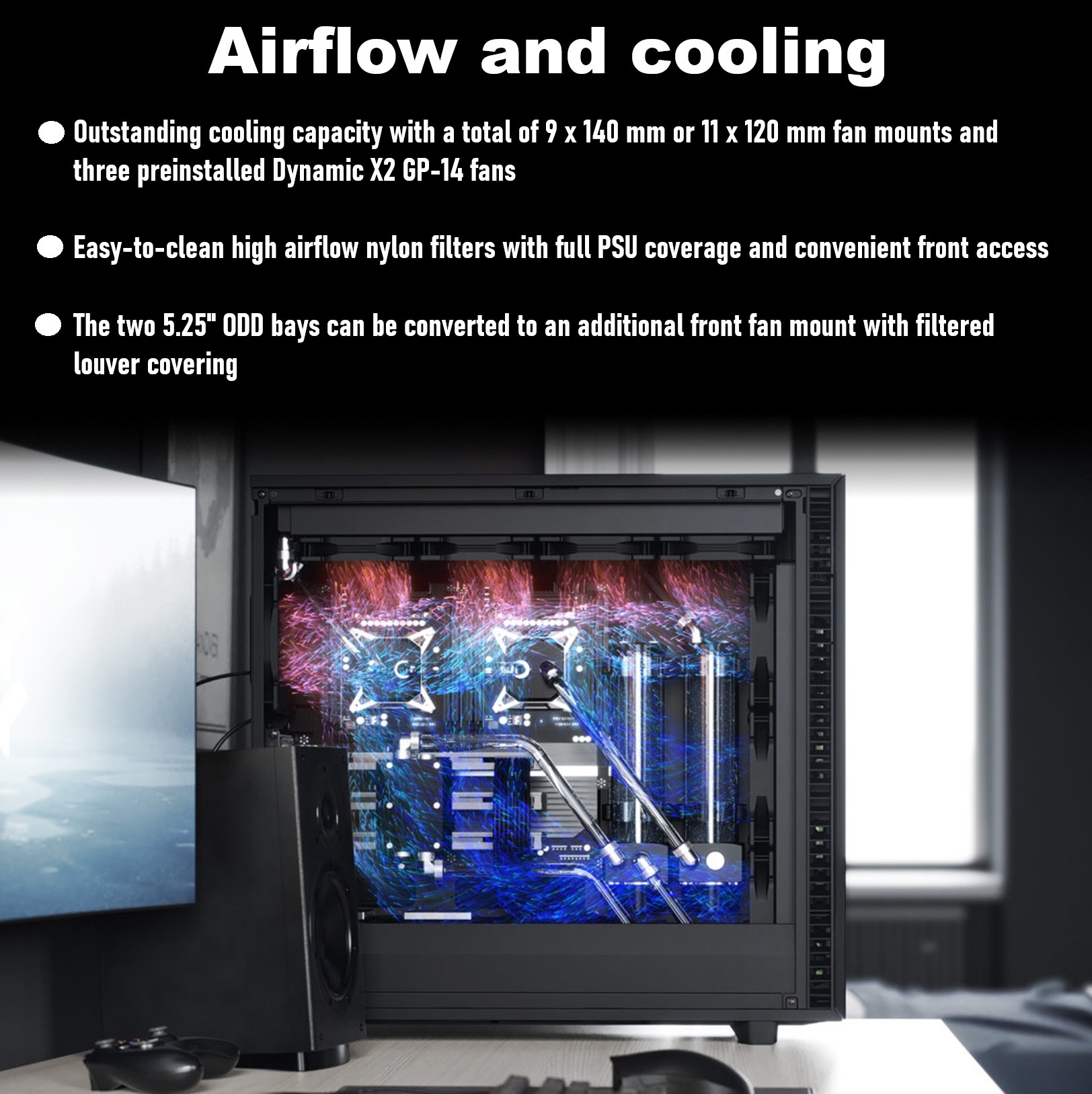 | Front Fan Options | 4 × 120 mm or 3 × 140 mm (2 × Dynamic X2 GP-14 included) |