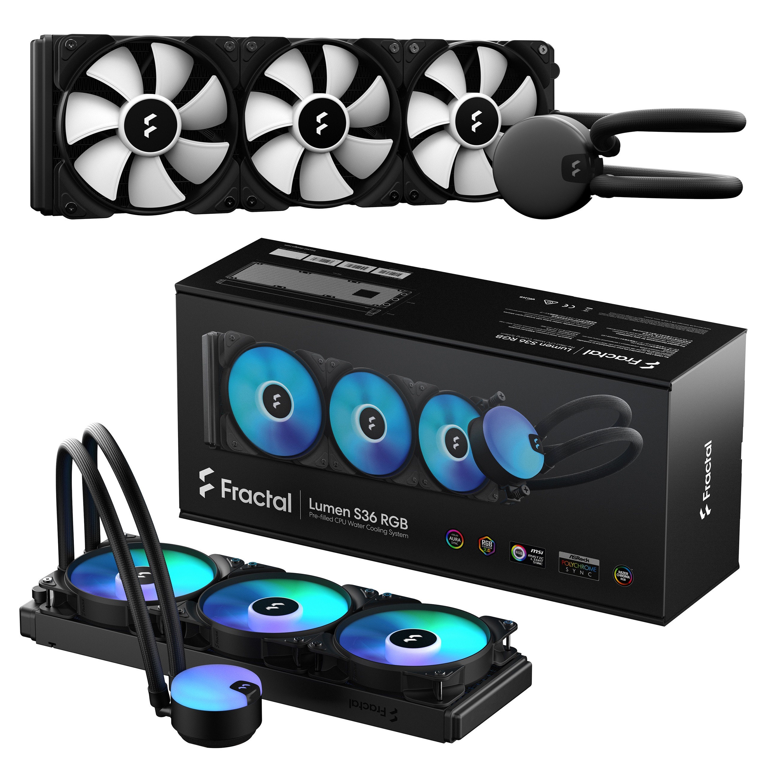 Fractal Lumen S36 RGB V2 AIO Liquid Cooler – 360mm Radiator, Triple Aspect 12 RGB PWM Fans, Six-LED ARGB Pump, Dark Stealth Mode, Rotatable Top, Pre-Applied Paste, LGA 1851/1700 & AM5 Support | BLACK ~ FD-W-L1-S3612