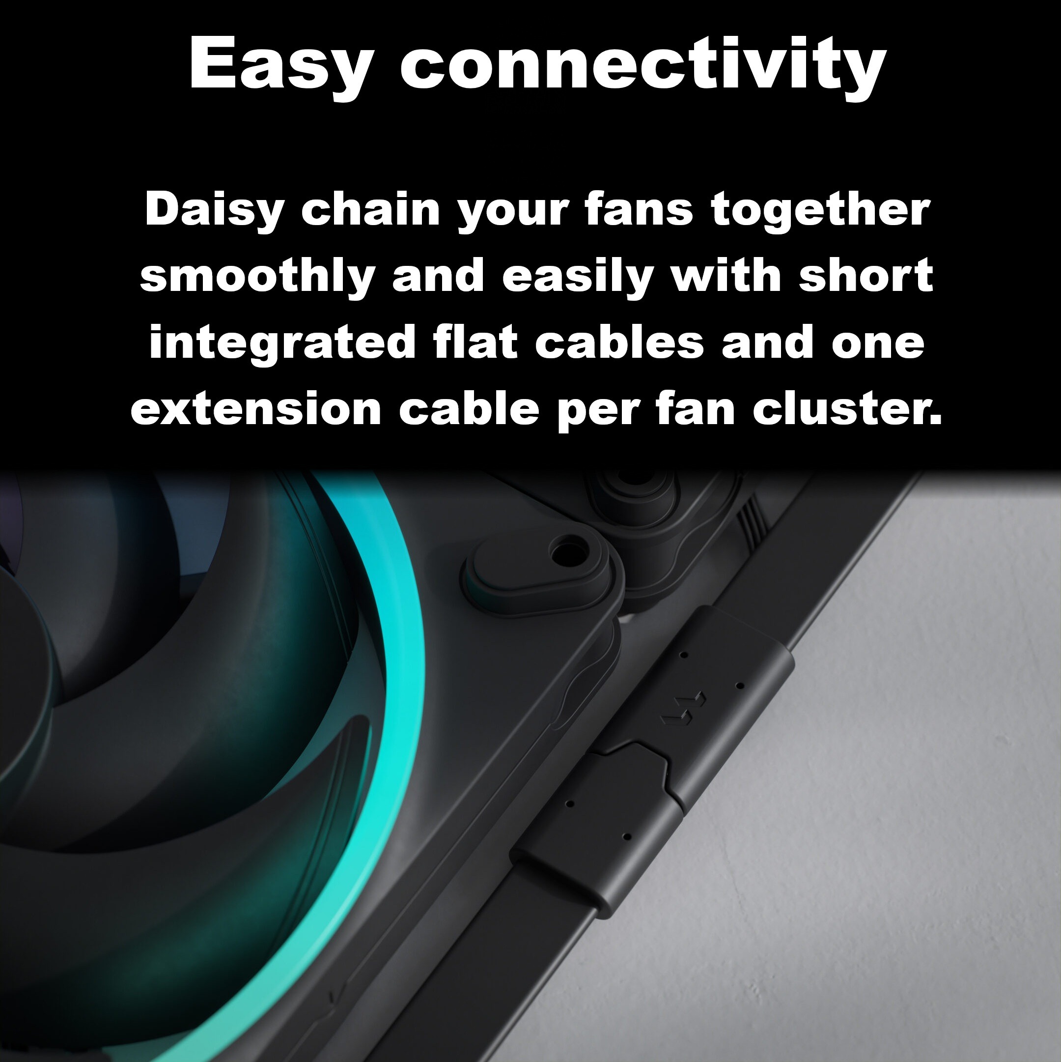 • Daisy Chain Connectivity: Short integrated flat cables + a 500 mm extension cable per cluster make fan chaining clean and painless—no spaghetti wiring.