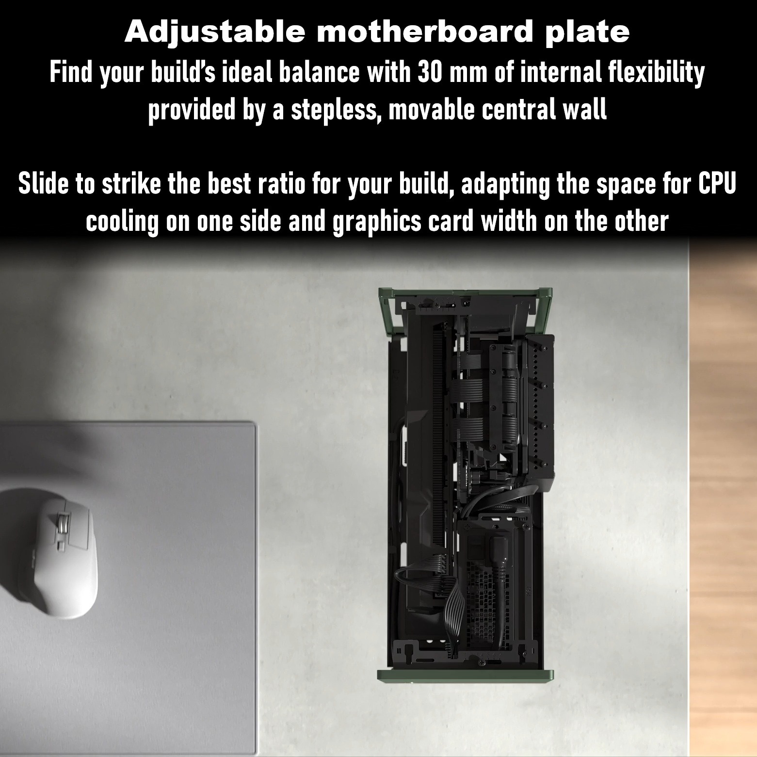 - Adjustable Central Wall (a.k.a. The Sliding Dimension Gate) — 30 mm of stepless adjustability to optimize either CPU cooler height or GPU width.