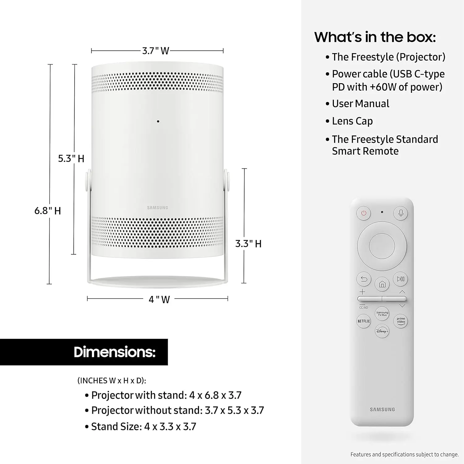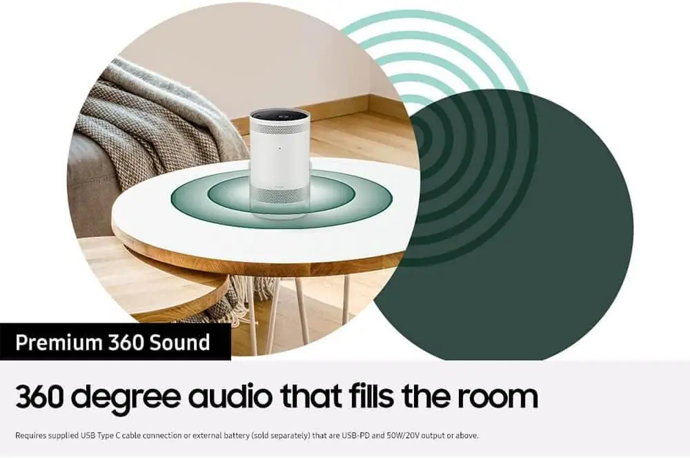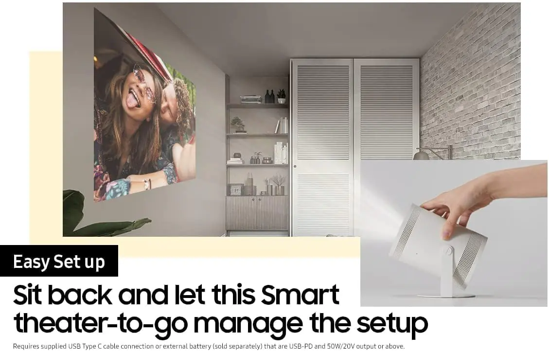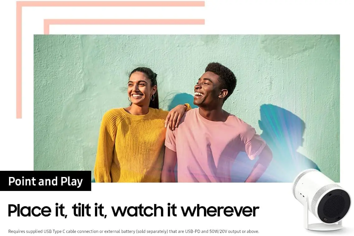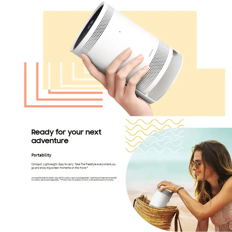 The Freestyle by Samsung , FHD HDR Smart Portable Projector for Indoor and Outdoor Home Theater ; 550 LED Lumen ; Big Screen Experience 30″ – 100″ & 180° Dynamic Angle ; with Premium 360° Sound ; Alexa Built-In ; Smart TV ; with Remote Control | WHITE SP-LSP3BLA