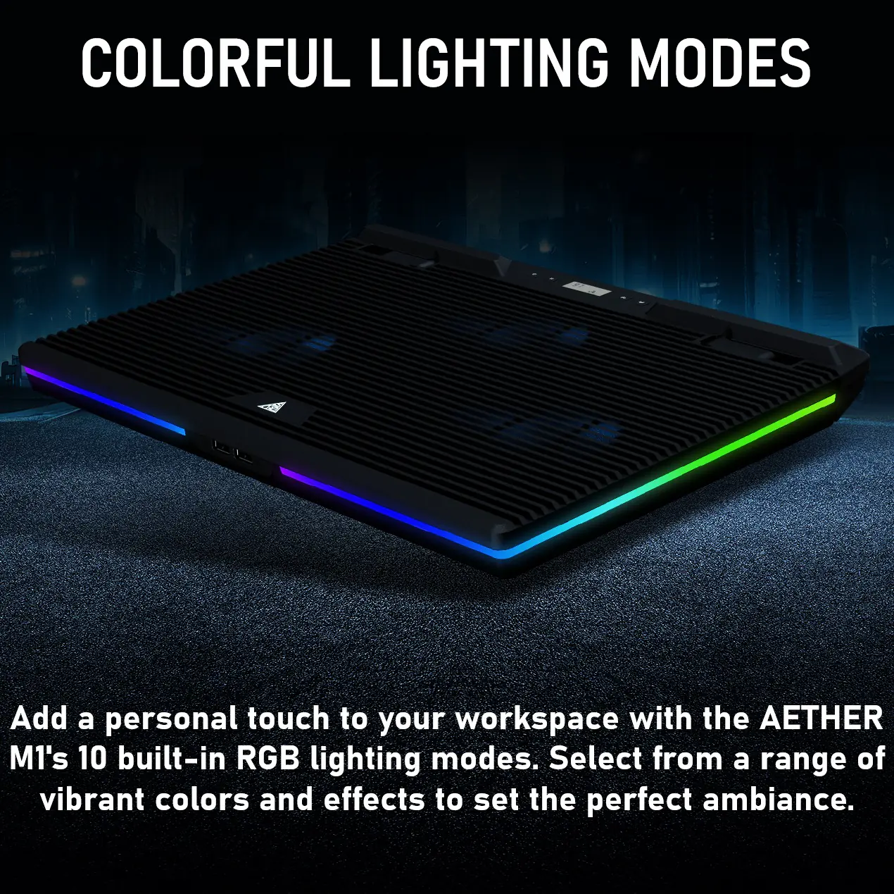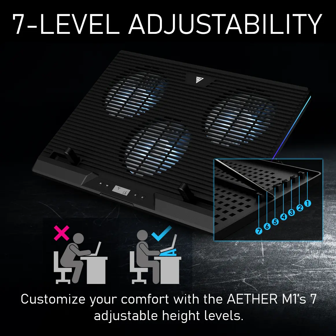 - Triple Threat Cooling: Equipped with three 120mm fans pushing 28.23 CFM each, the AETHER M1 delivers breezy airflow to keep your laptop’s thermals in check—even during marathon sessions.