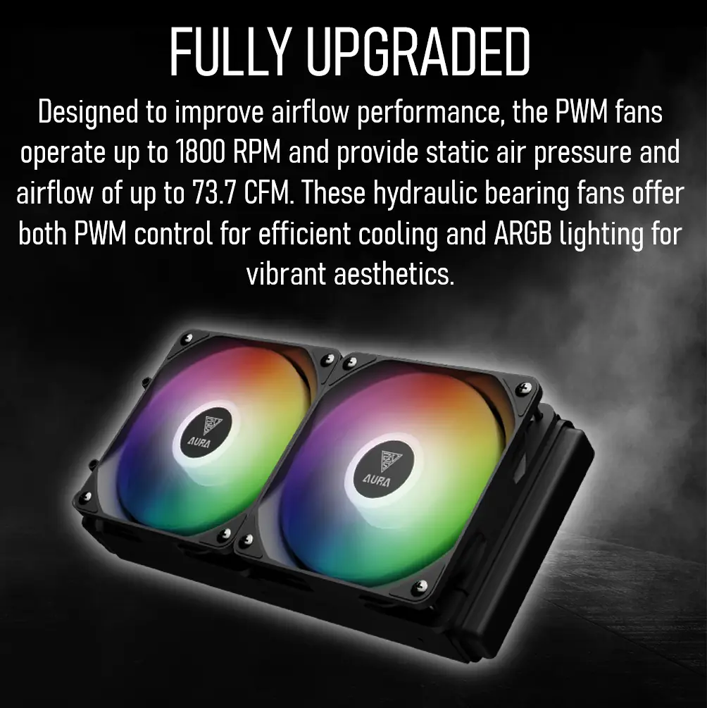 - Dual High-Efficiency PWM Fans : Two 120mm hydraulic-bearing fans provide up to 73.7 CFM of airflow at speeds up to 1800 RPM, while PWM control enables smart, temperature-based fan speed adjustments.