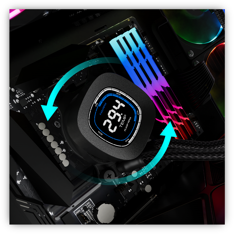 The CHIONE M4-420 liquid cooler delivers powerful cooling for your CPU through its patented in-line PWM pump, a 32mm thick radiator, and three 140mm ARGB fans to reach new levels of coolness. It also features a 2.1″ LCD screen on the water block that displays CPU temperature, fan speed, and pump speed stats in real-time.