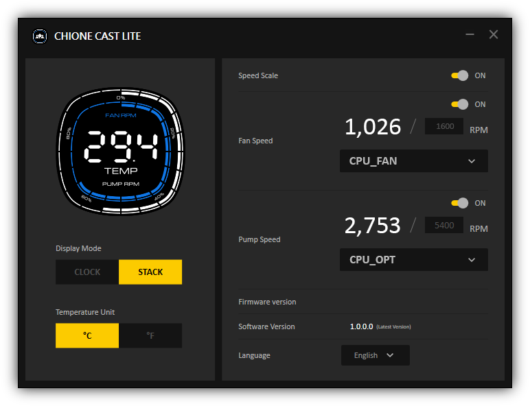 CHIONE CAST LITE software allows you to customize display mode, temperature units, setting up the highest fan and pump speeds, as well as disable the speed scale.