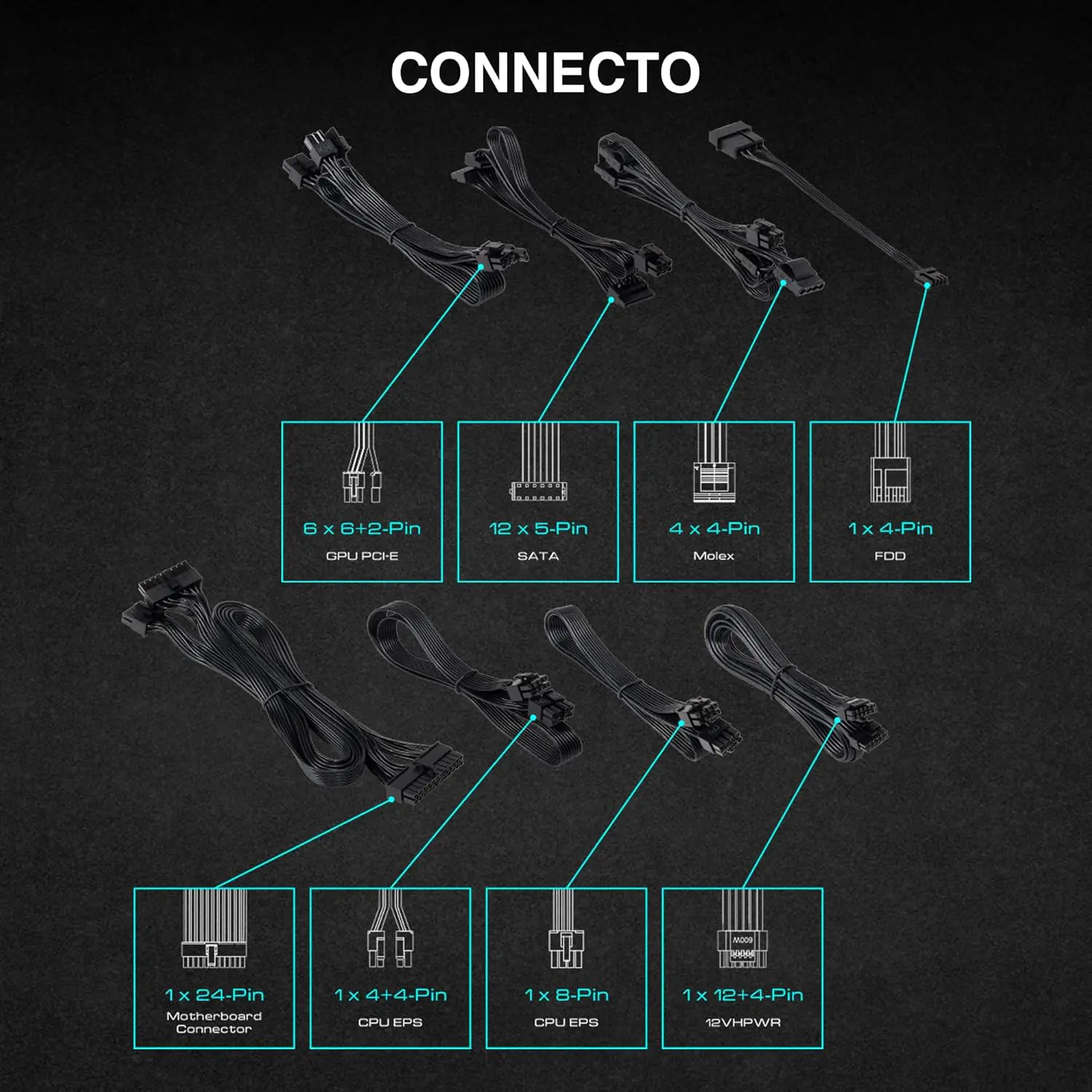 - Extensive GPU & System Support : Equipped with 4 PCIe (6+2) connectors, 1 native 12VHPWR, dual CPU EPS (4+4), 12 SATA ports, 4 Molex, and even a floppy plug for legacy setups.