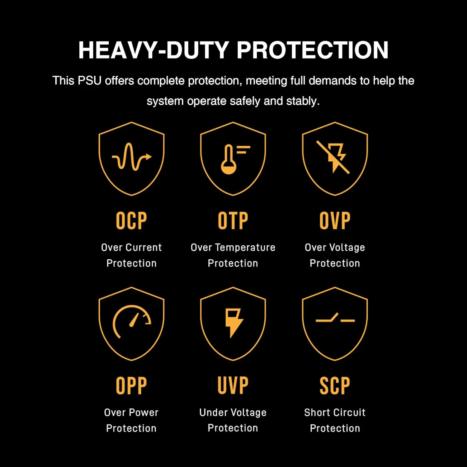 - Built-In Heavy-Duty Protections : Includes OVP, UVP, OPP, SCP, OCP, and OTP safeguards to keep your system running safe and sound under all conditions.