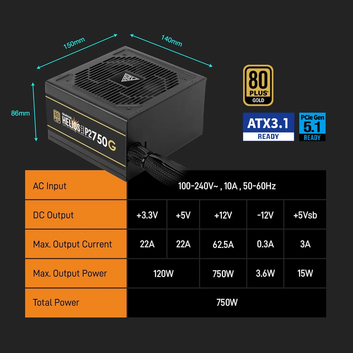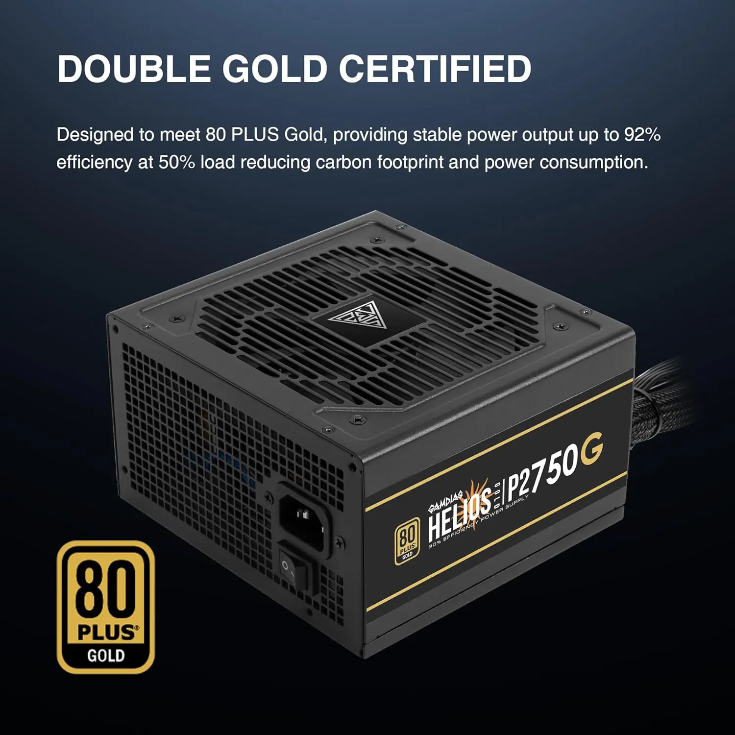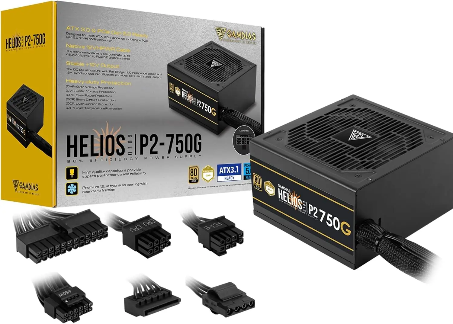GAMDIAS HELIOS P2-750G 750W 80 Plus Gold PSU, ATX 3.1, PCIe Gen 5.1 Ready, 12VHPWR Cable, 120mm Hydraulic Fan, Heavy-Duty Protections, Non-Modular, DC-DC Design | BLACK