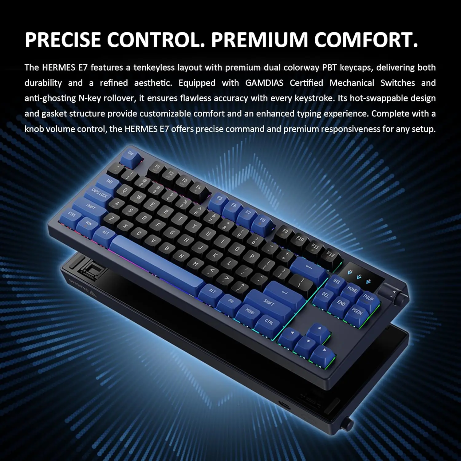 GAMDIAS Hermes E7 Wired 75% RGB Gasket Mechanical Keyboard With Red Switches, PBT Keycaps, Hot-Swap Support, Volume Knob, Anti-Ghosting, And N-Key Rollover, USB-A to Type-C Wired | ROYAL BLUE & GRAPHITE