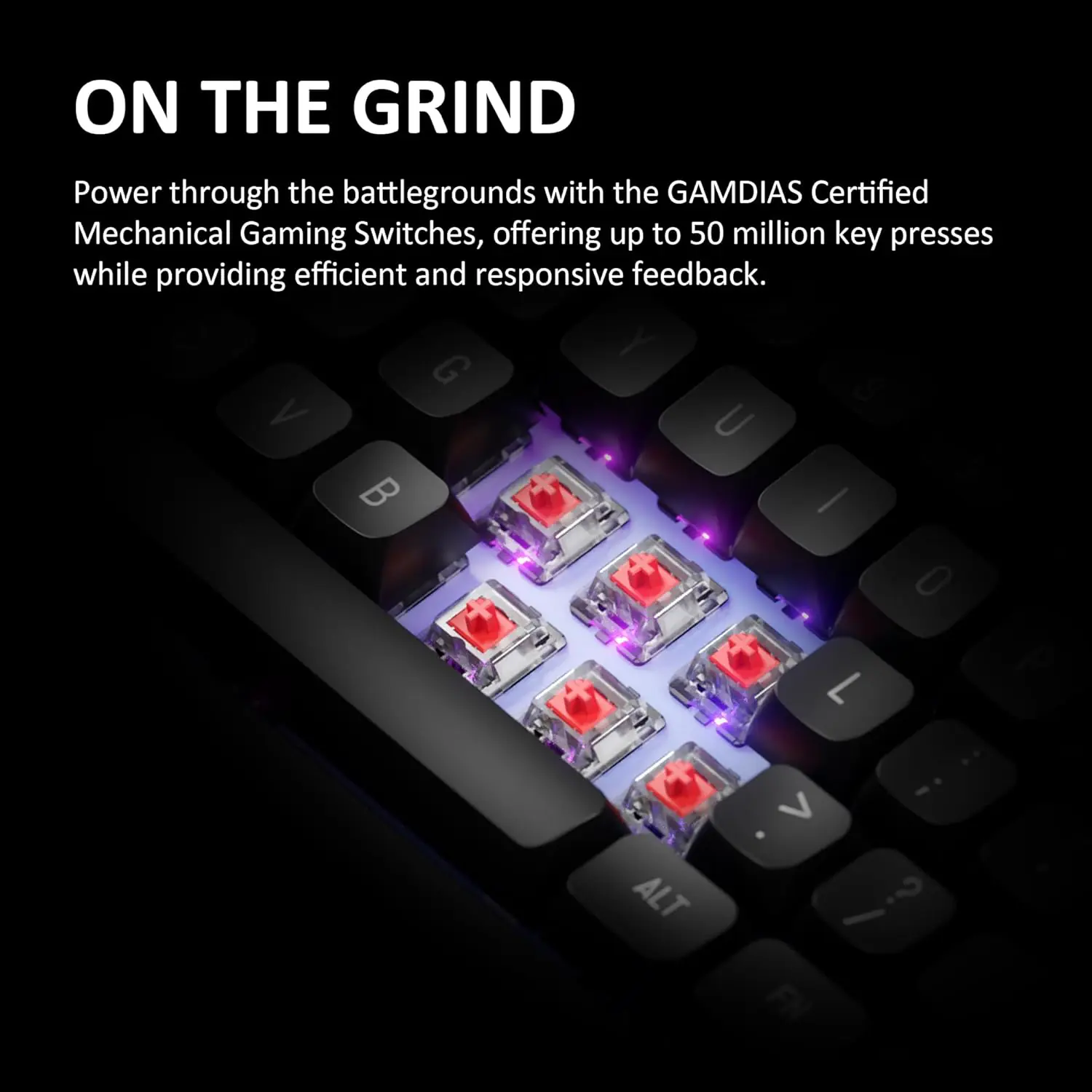 - GAMDIAS Certified Mechanical Red Switches โ Ultra-responsive and smooth with a 50-million keystroke lifespan. Great for gamers, writers, and heavy-duty keyboard warriors.